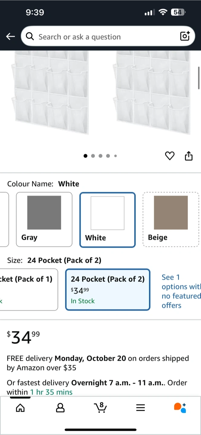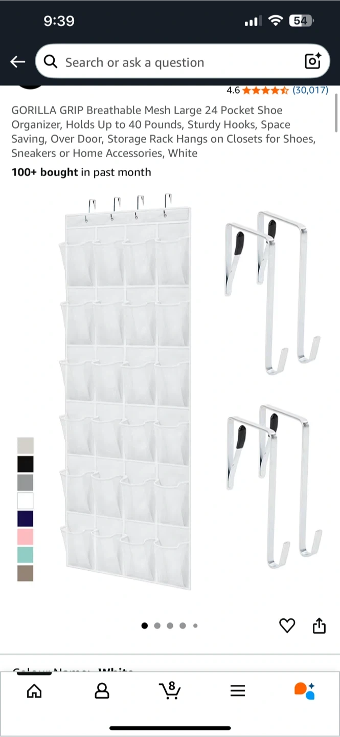 Keep your shoes neatly organized with this GORILLA GRIP breathable mesh over-the-door shoe organizer. It holds up to 40 pounds and features 24 sturdy pockets. The space-saving design hangs easily on closets for shoes, sneakers, or home accessories. Colour: White 2 pack brand new. Opened packaging to verify the style. Price is firm for both $20 together