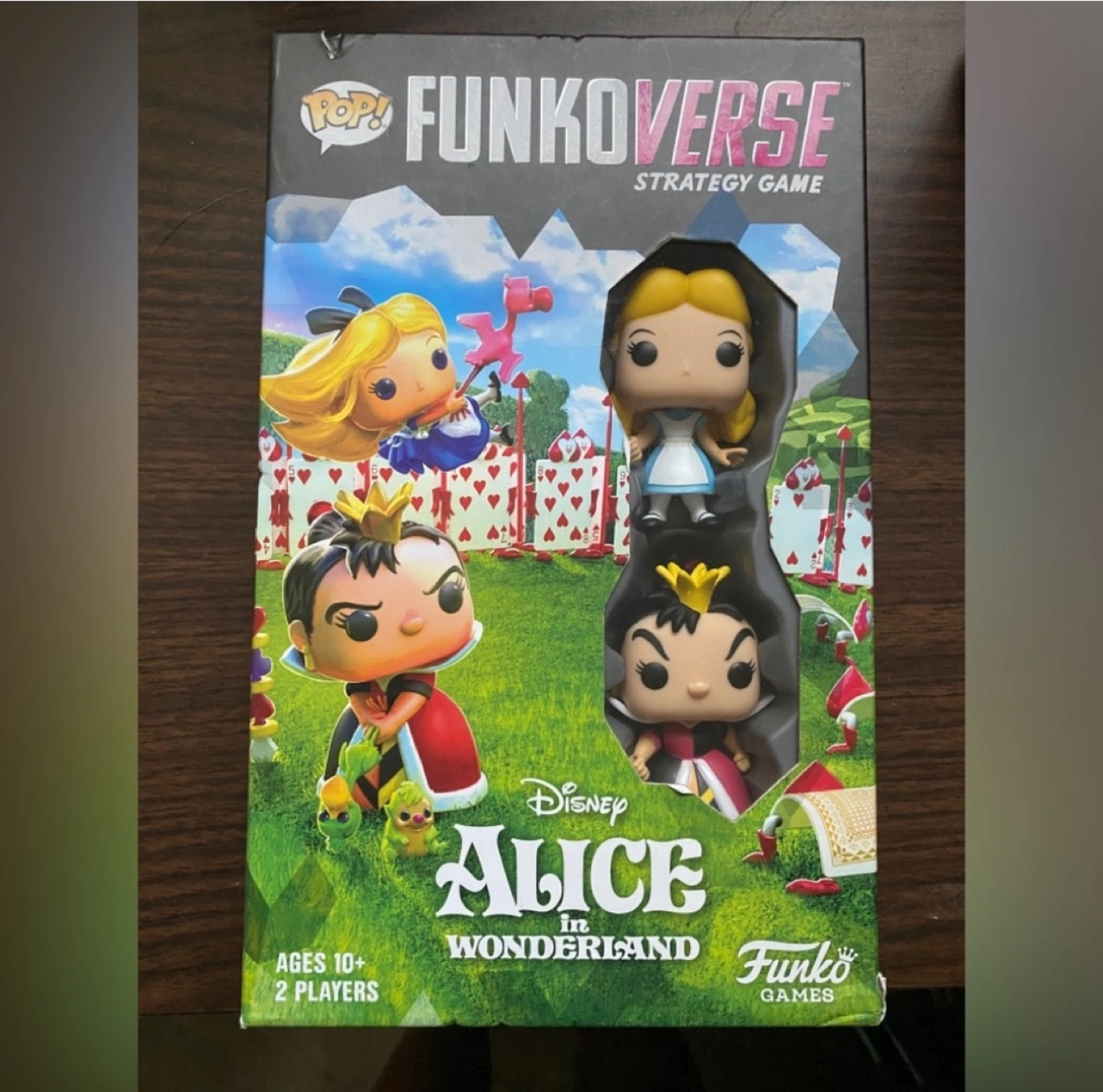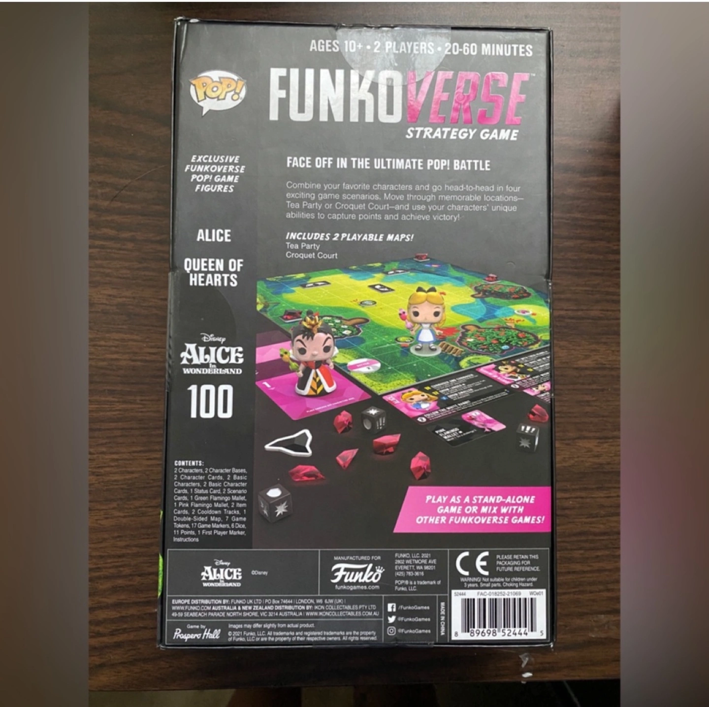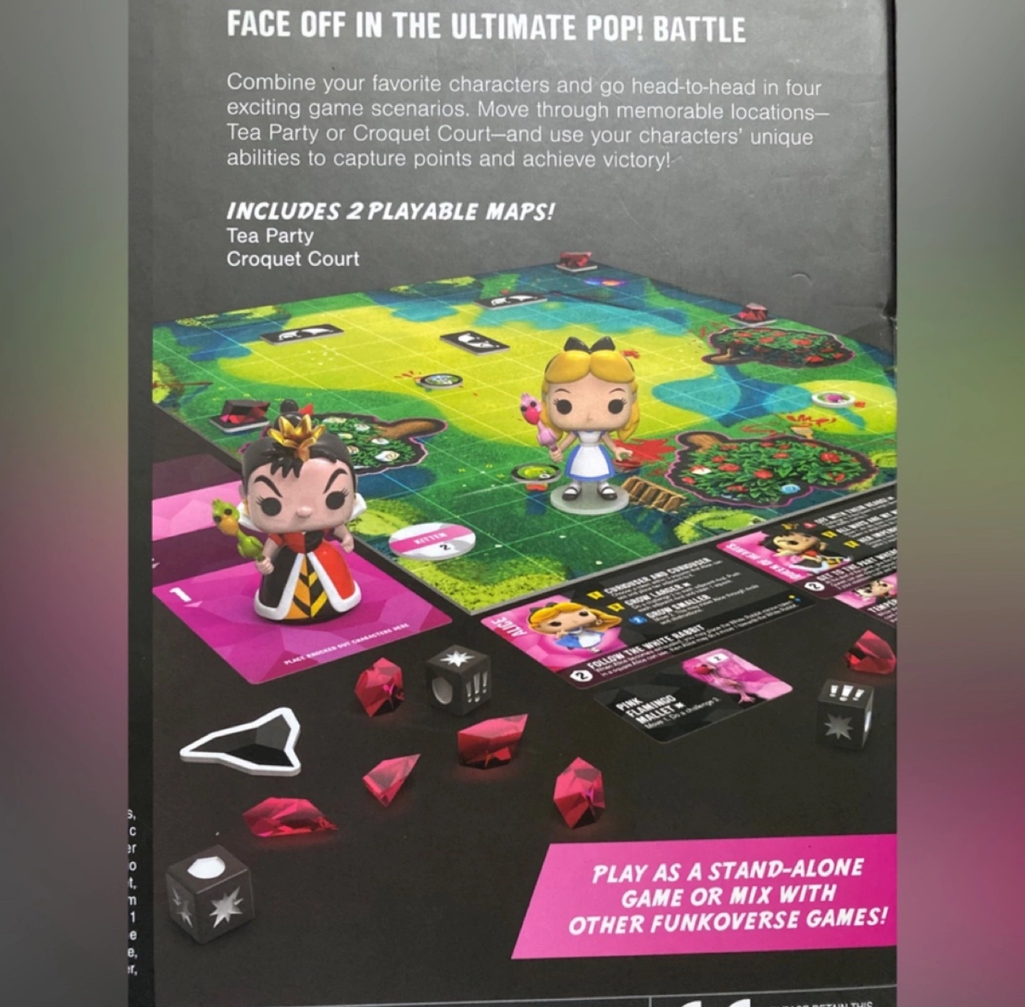 BRAND NEW IN BOX! (The box itself does have some wear & tear but is sealed/never opened- all pieces included!) FUNKO POP! ✨Alice In Wonderland Funkoverse Strategy Game 100 Expansion 2-Pack Funkoverse Strategy Game: Alice in Wonderland 100 is a standalone game that comes with the characters Alice and The Queen of Hearts. This set may be used with others, giving you the ability to assemble the team you want! *details: In the Funkoverse Strategy Game, you combine your favorite characters and go head-to-head in exciting game scenarios. Each turn, you select one of your characters and perform two actions. Each character has access to basic actions like moving and challenges as well as several unique abilities that may be performed only by spending ability tokens. Funkoverse uses an innovative “cooldown” system — the more powerful the ability, the longer it will take for the ability token to become available again — so players have to spend their ability tokens wisely. Each character in Funkoverse is unique, so players are encouraged to try out different combinations of characters and items in order to discover their favorite synergies and powerful strategies for the different game scenarios.
