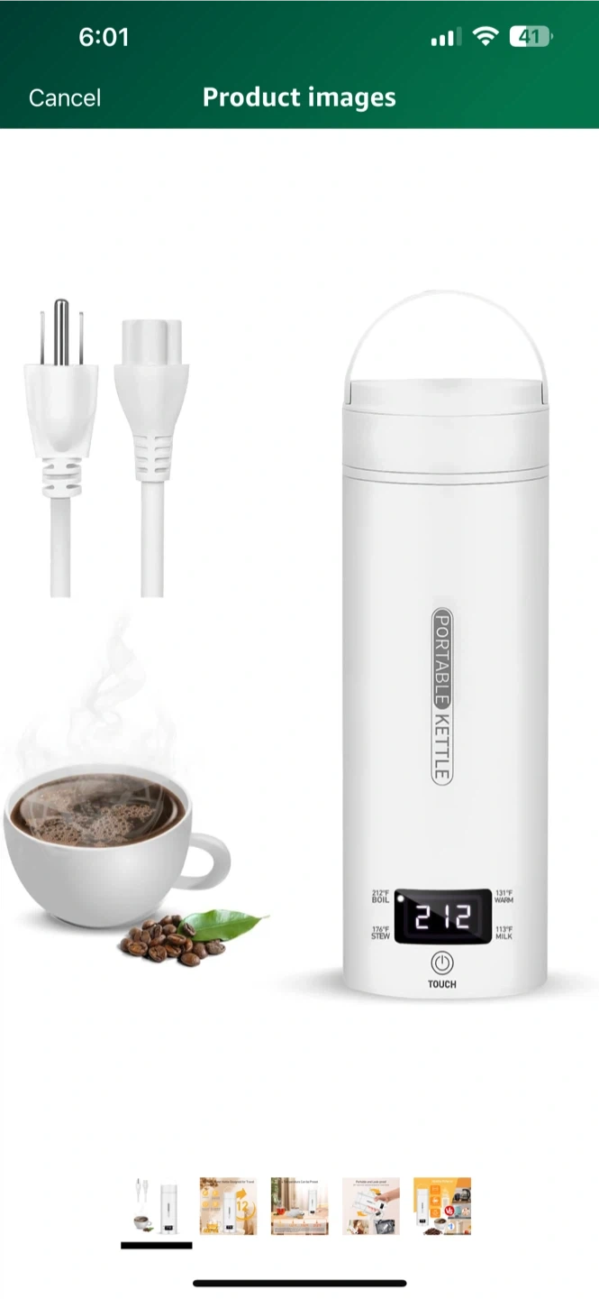 1000+This portable electric kettle is designed for travel and is leak-proof. It has a compact size and is made with healthy and odourless materials. It can heat at any time and has 4 temperature presets. Also features 12 hours of heat preservation and short circuit protection. It's made of 304 food grade stainless steel. It’s brand new in box