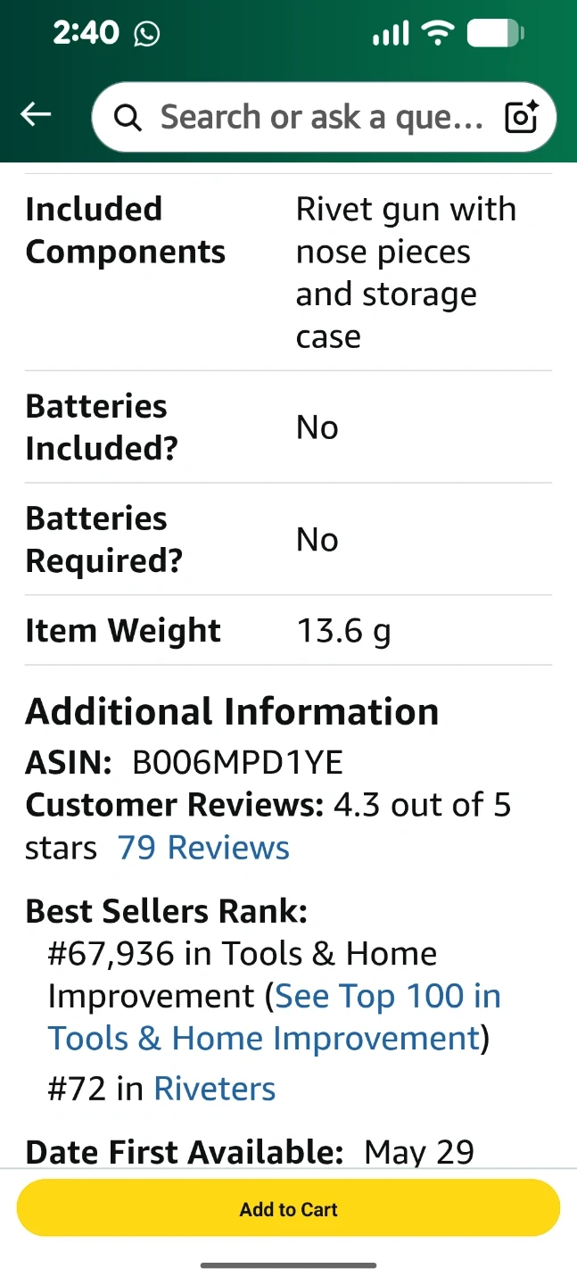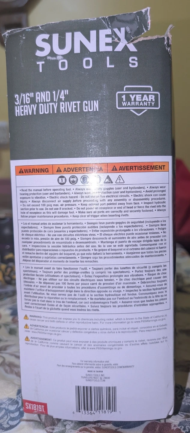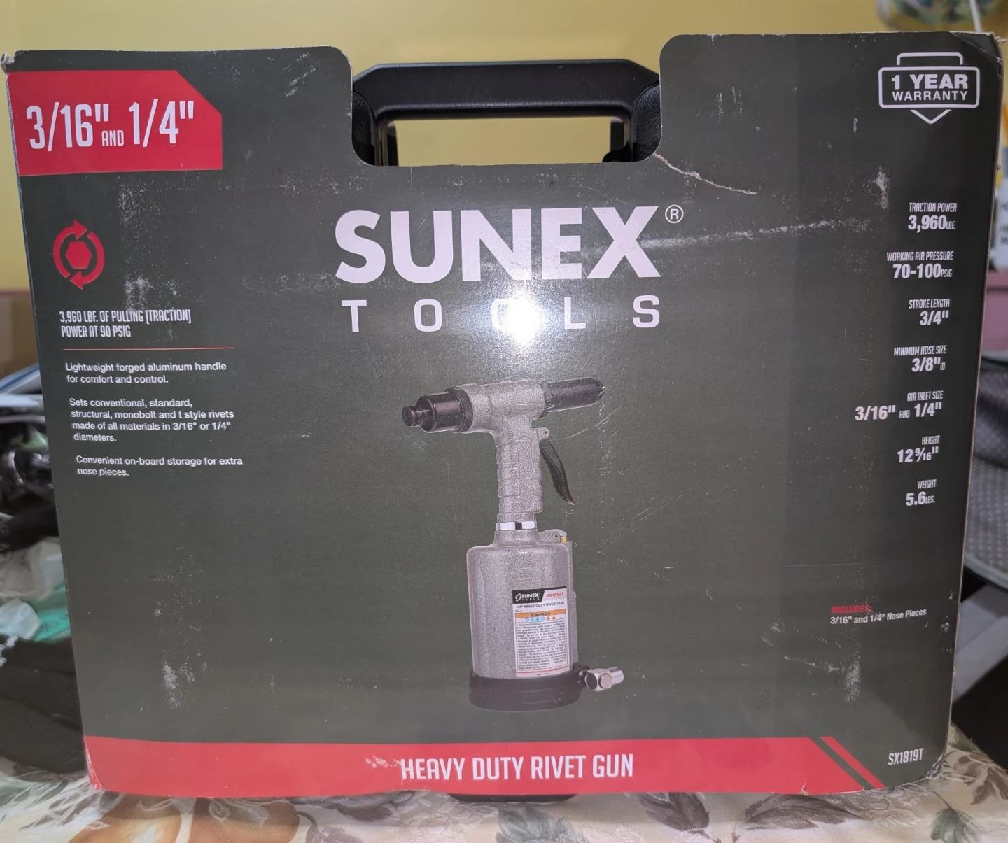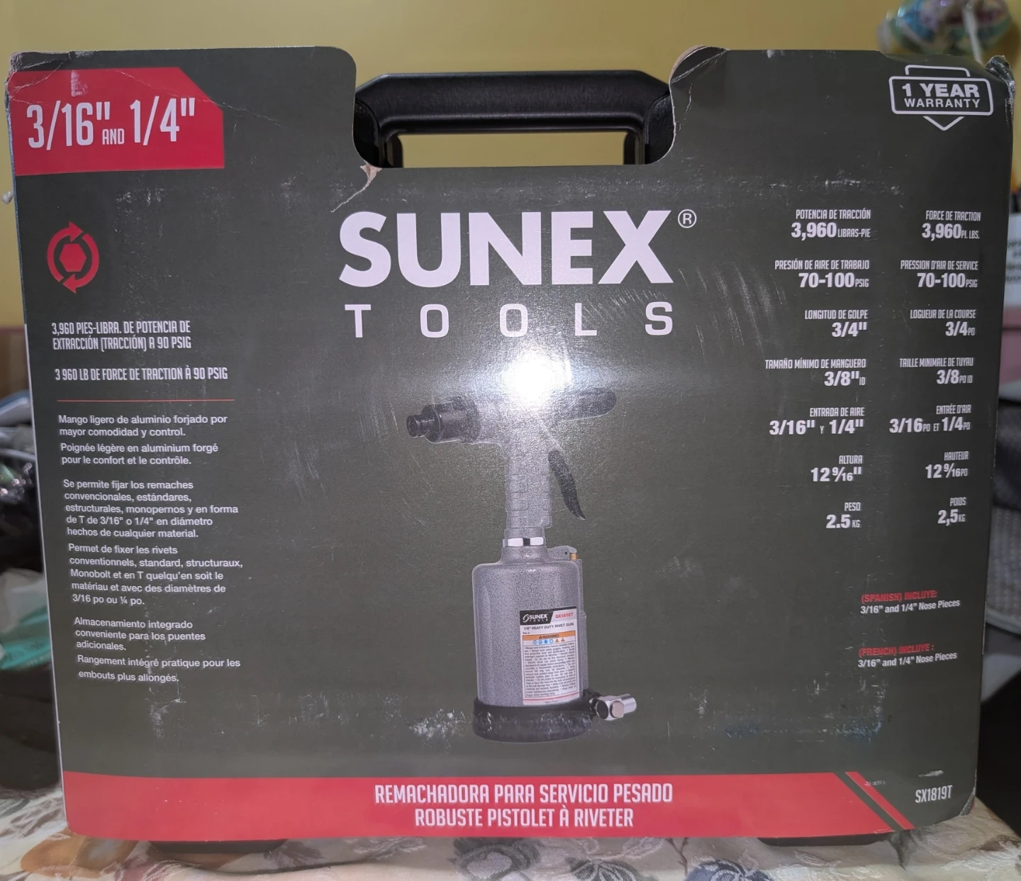 96Brand New In Box Sunex 3/16" and 1/4" heavy duty rivet gun. Purchased as a gift in 2013 but never used. 3960 lbf, 90 psi, other specifications in photos as well as proof of purchase price. Paid $690 with tax, currently selling for $674 without tax. Asking $450.