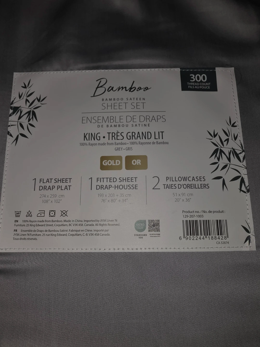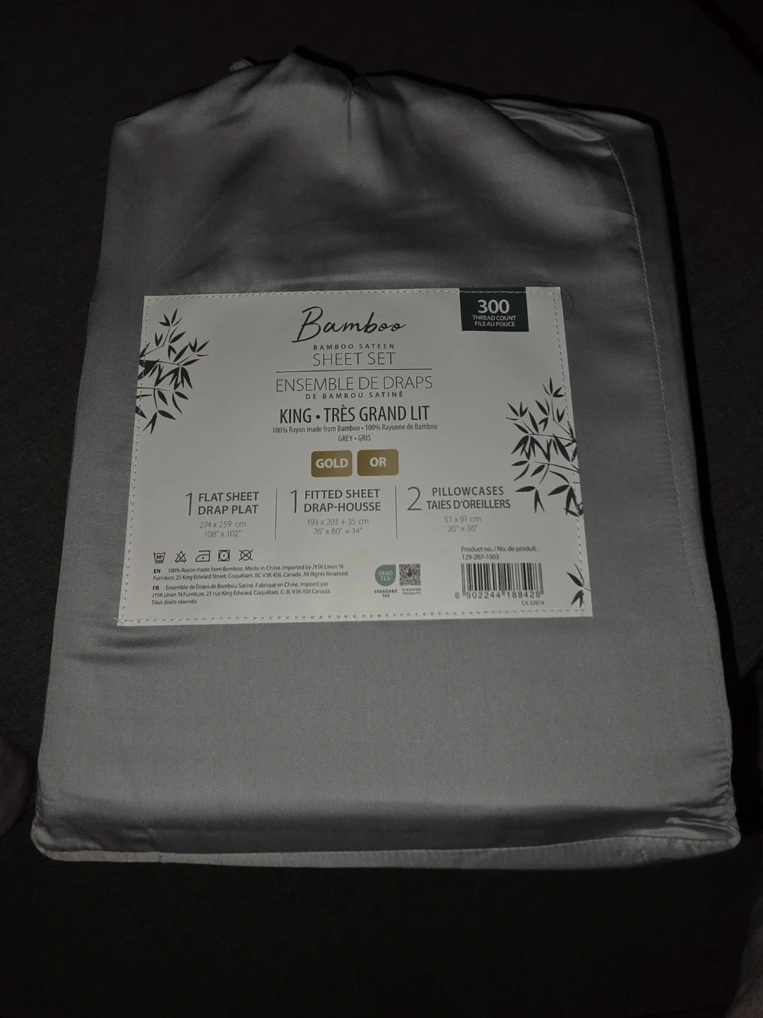 158Brand new never used still in Packaging king size sheet set Retails for $119 Includes one flat sheet one fitted sheet two pillow cases 100% rayon made from bamboo Grey