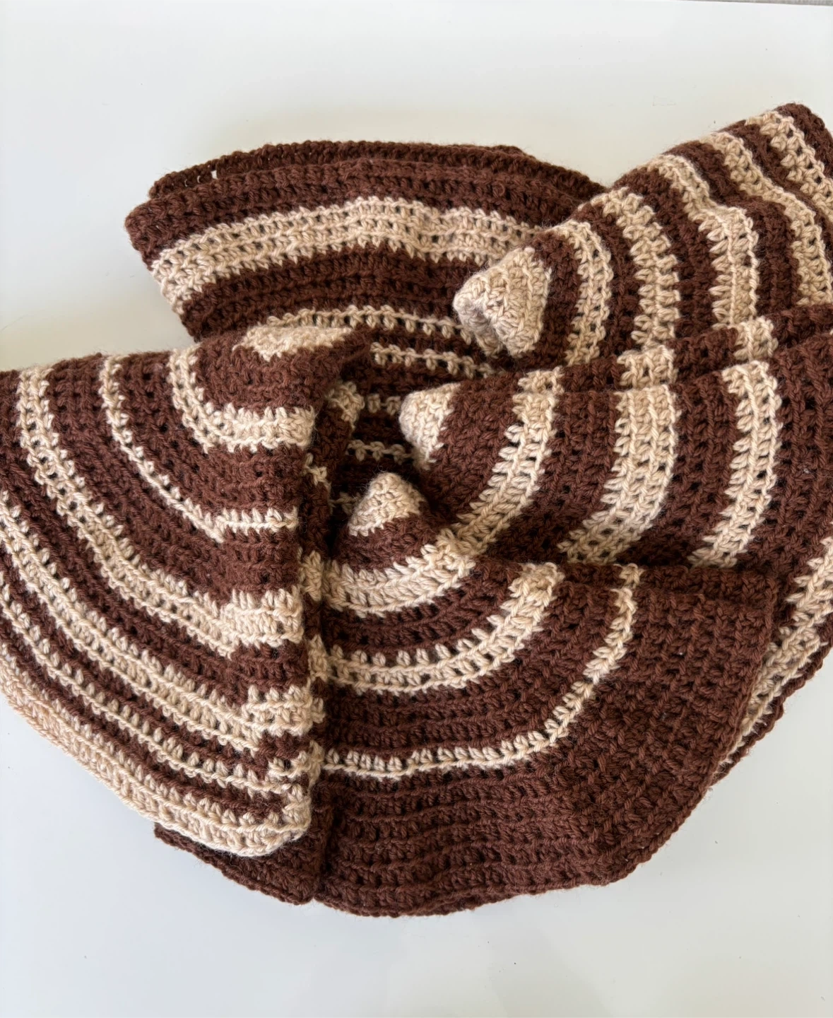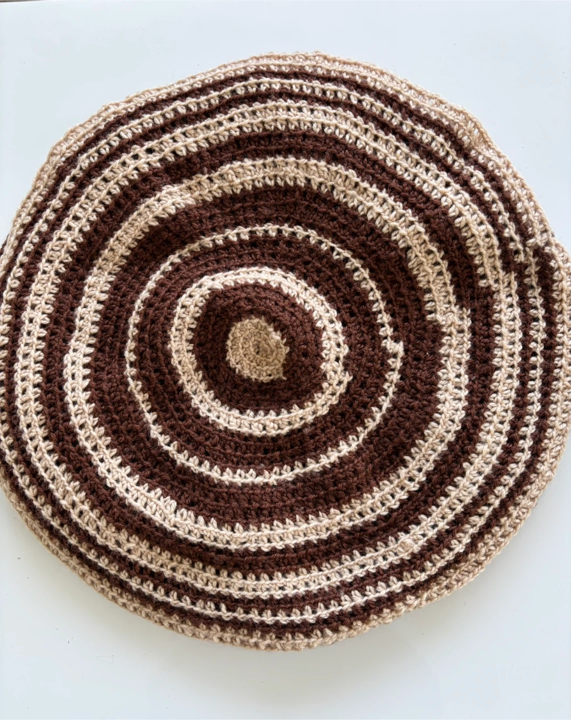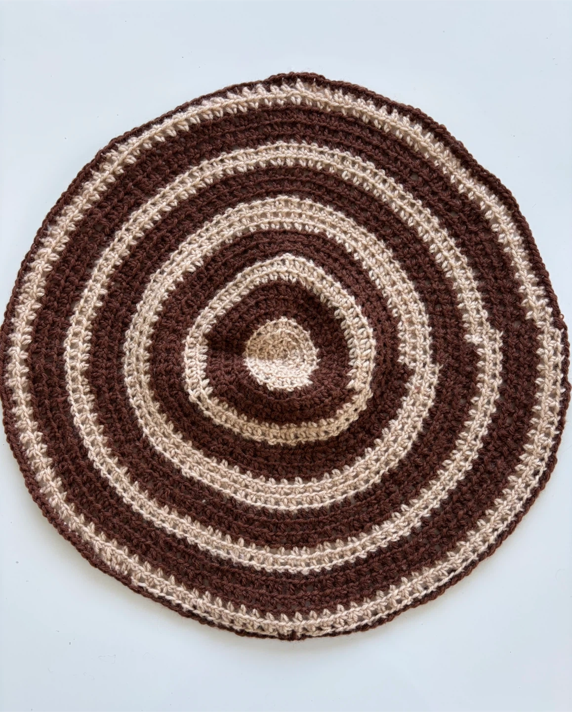 There are 5 handmade crochet rugs with a concentric circle design. They are made of yarn in brown and beige tones. Three of them measure approximately 16β in diameter, one measures 19β and a smaller one 15β in diameter.