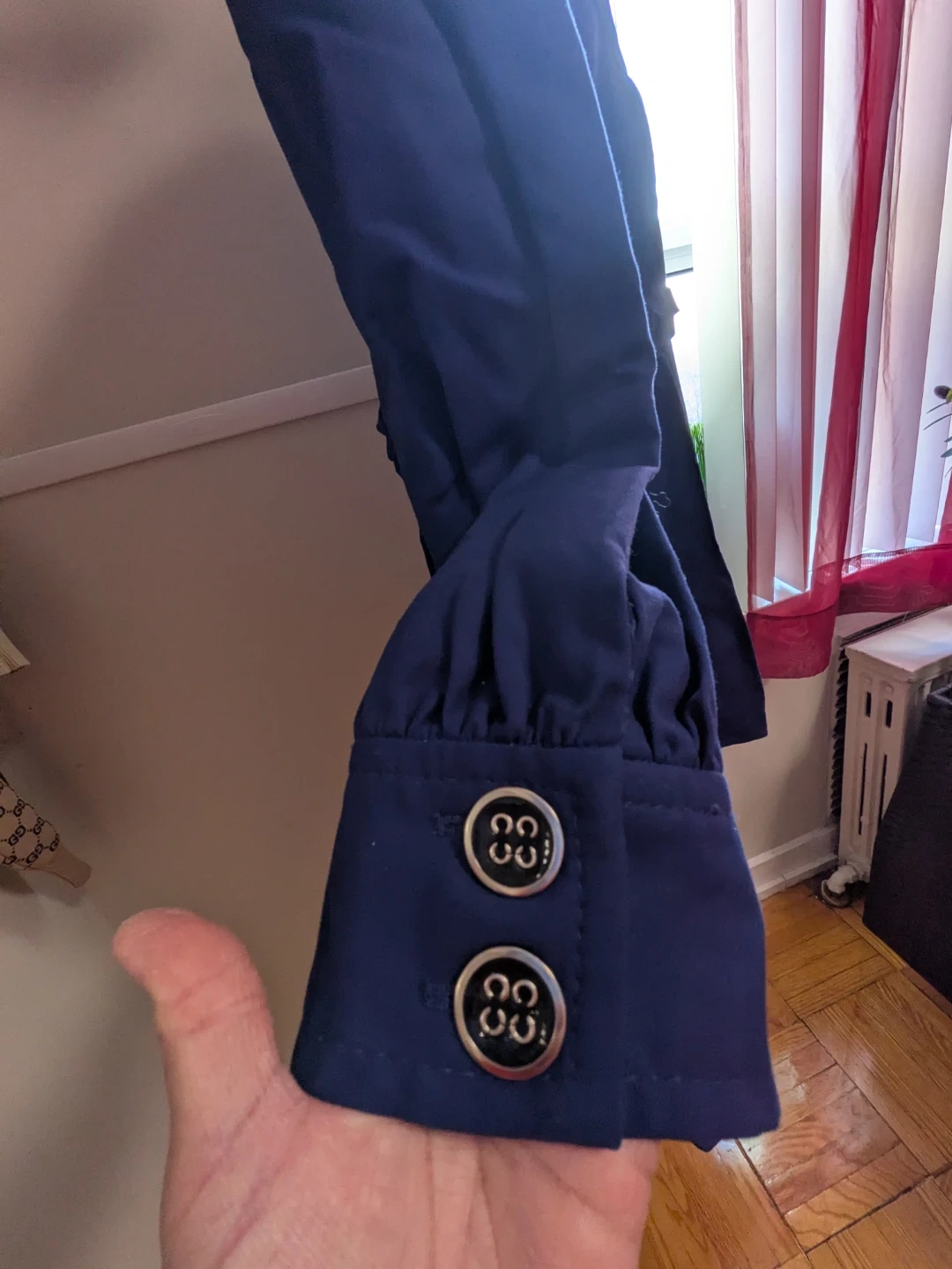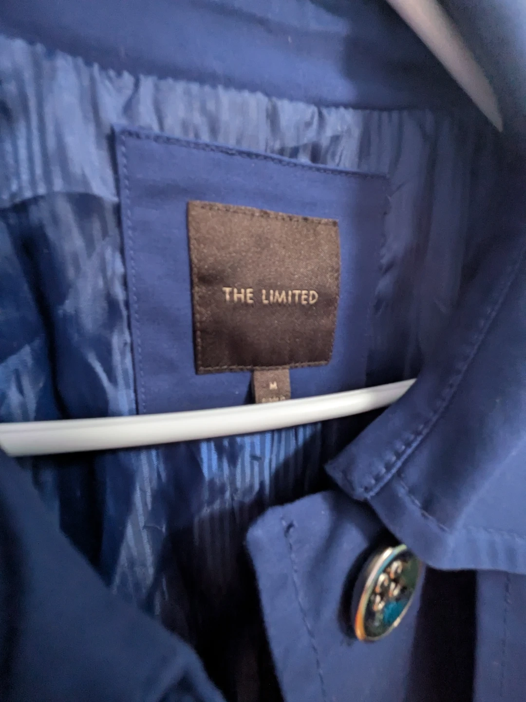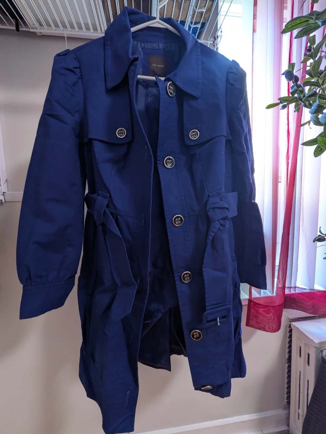 This is a navy blue trench coat from The Limited. It's a size medium and features decorative button details on the sleeves and front. The coat comes with a matching fabric belt to cinch the waist.
