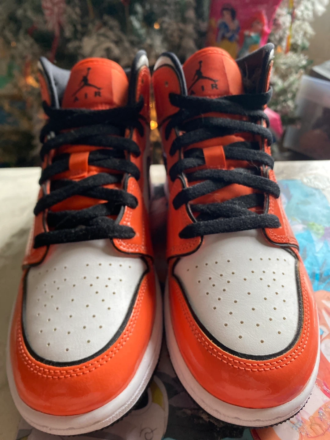 Selling a pair of Nike Air Jordan 1 Mid sneakers in orange and white. They're in great condition and ready for a new owner!