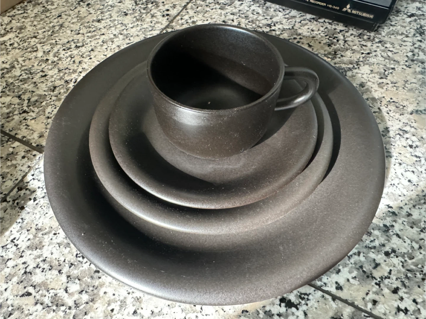 This IKEA MINUSKEL set includes four cups, four saucers, four bowls, and four plates. It's made from durable stoneware in a matte black finish. This dinnerware set is perfect for everyday use or special occasions.