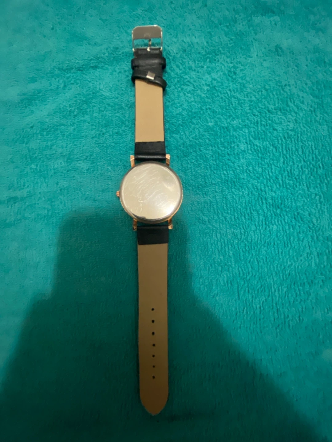 This is a black leather strap watch. It features a rose gold-toned case and a black dial. The strap is made of genuine leather. It's a simple and stylish accessory.
