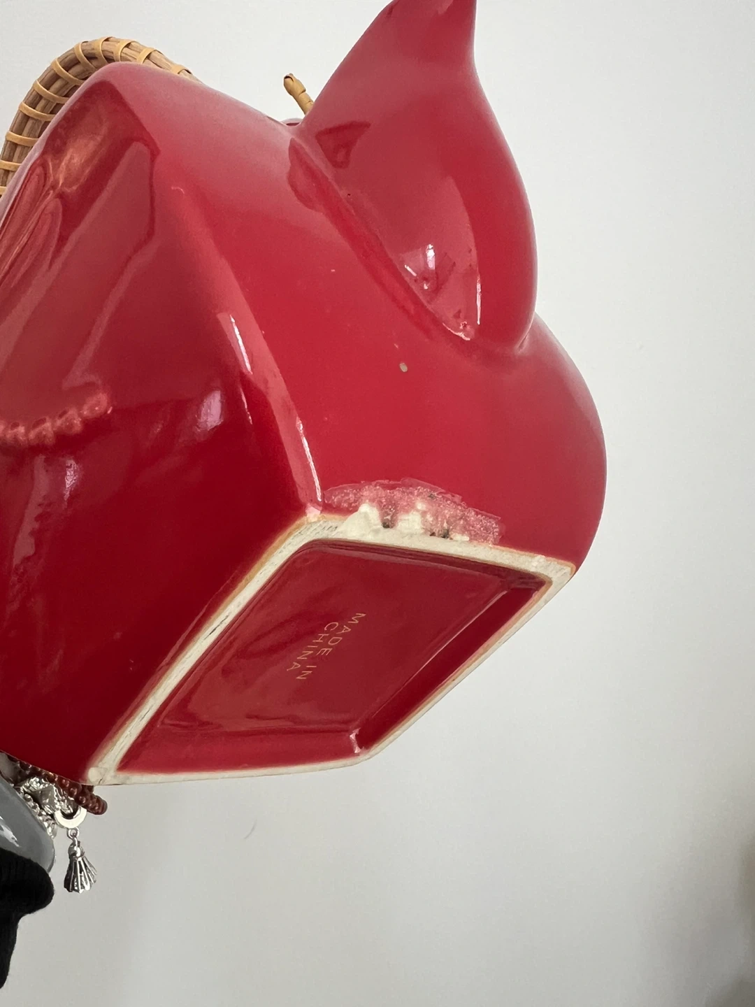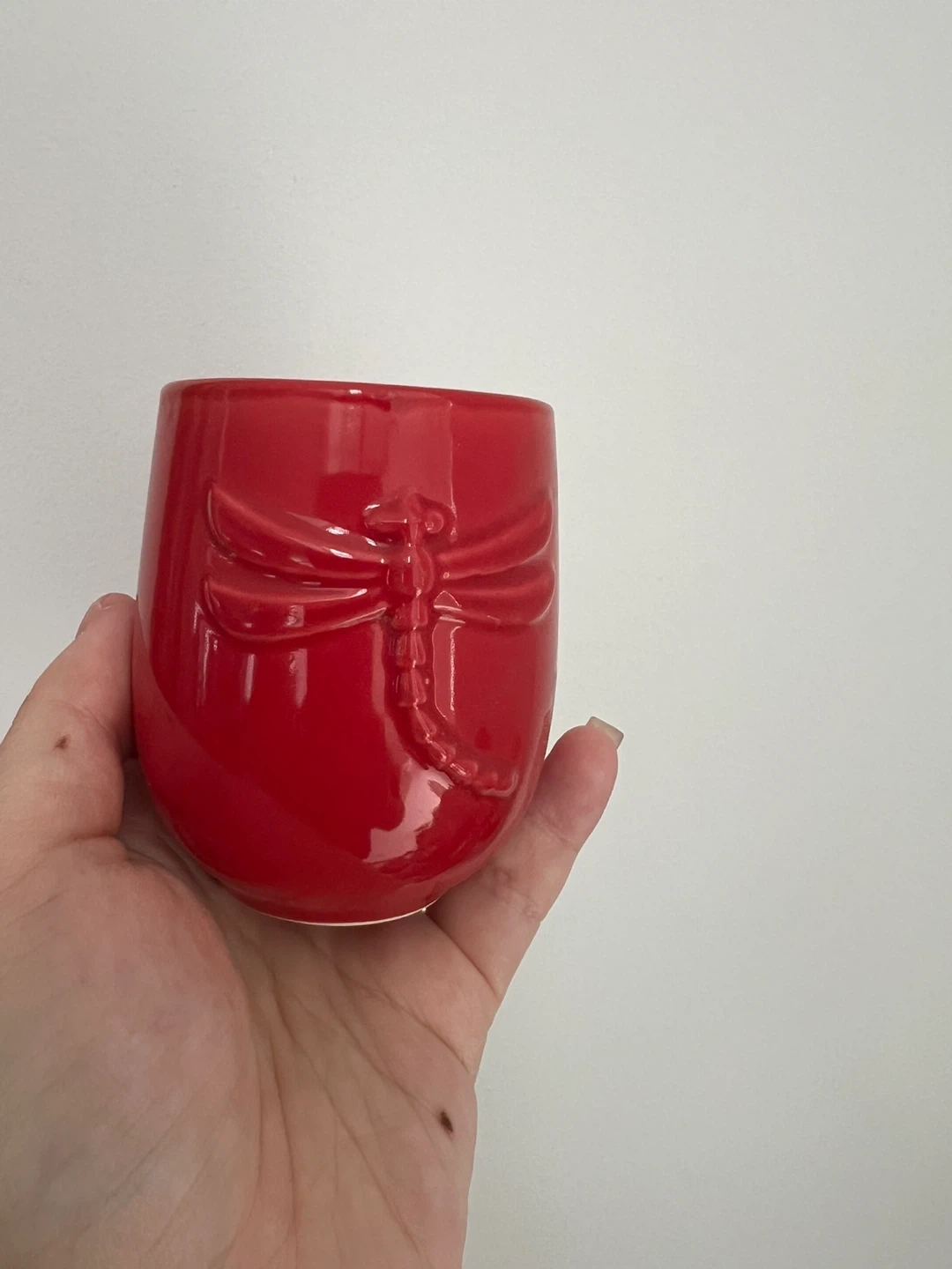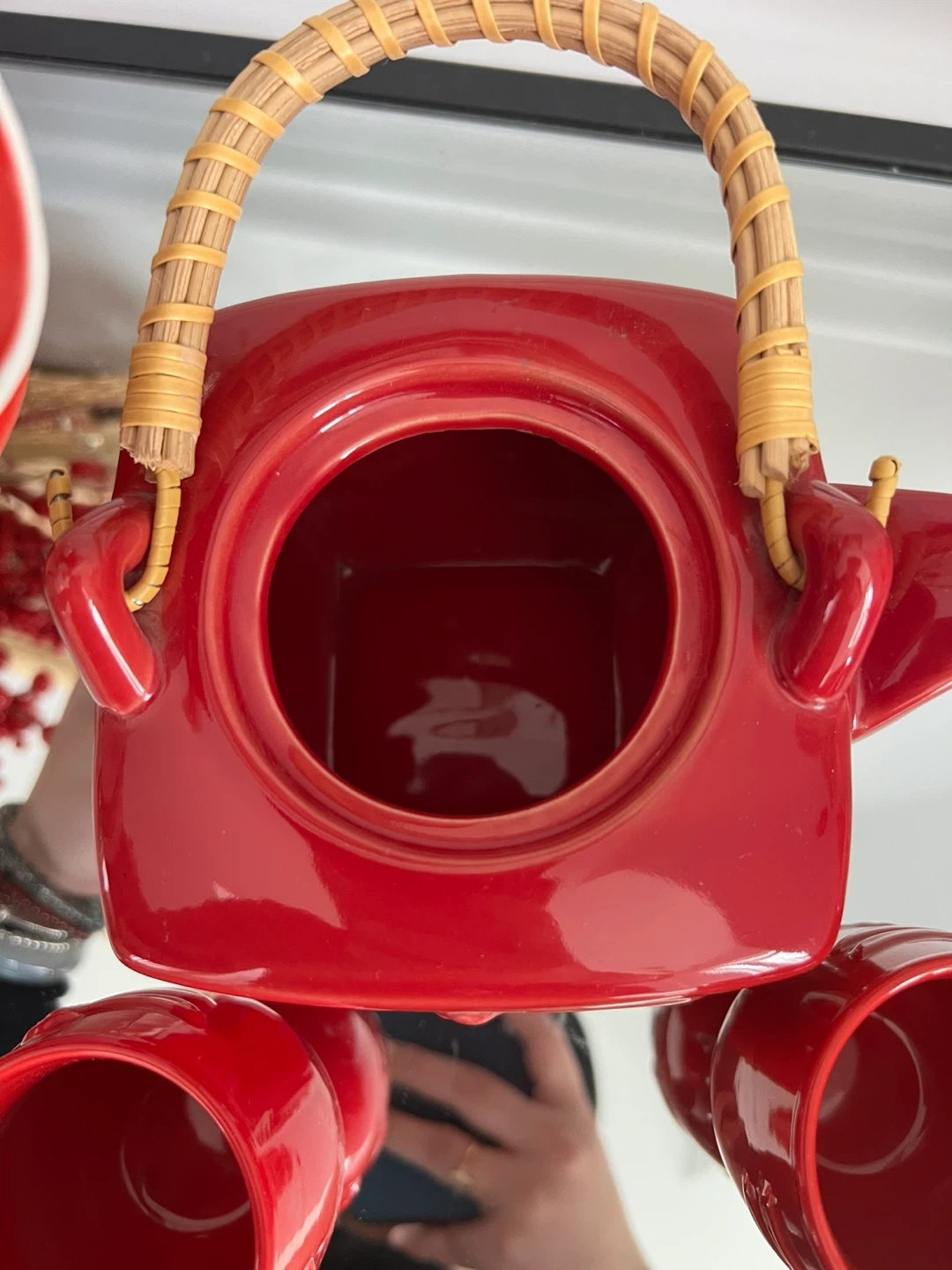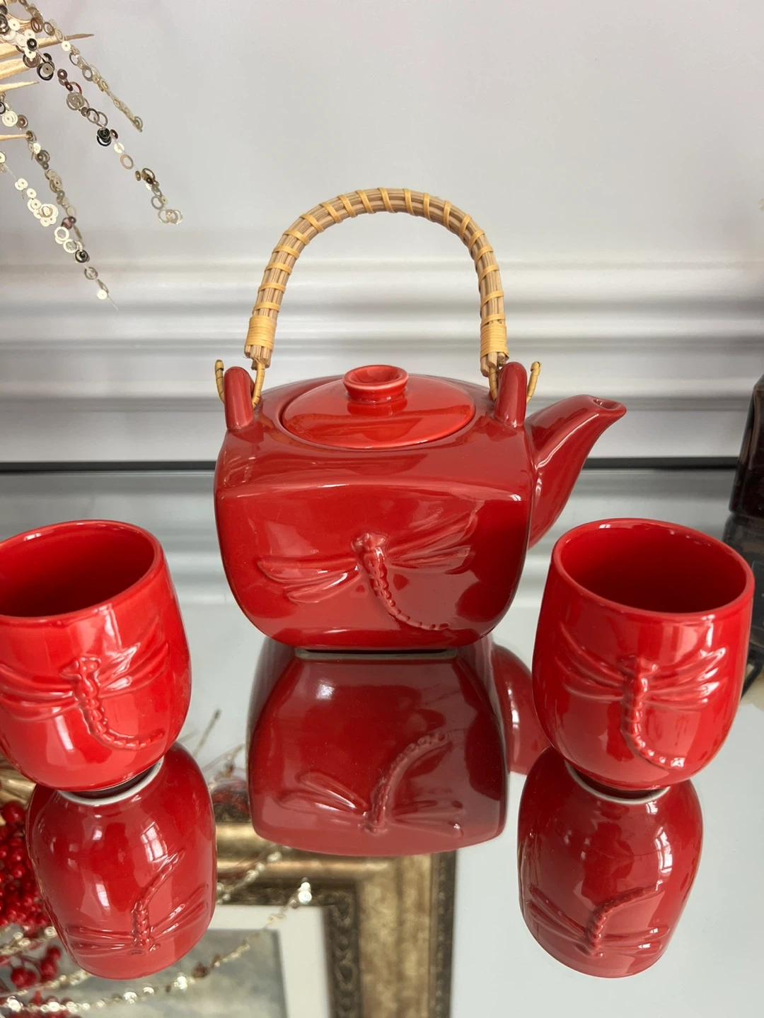 This charming red ceramic tea set features a delicate dragonfly embossed design. It includes a teapot with a woven handle and two matching cups. Perfect for enjoying a quiet moment with tea. Made in China.