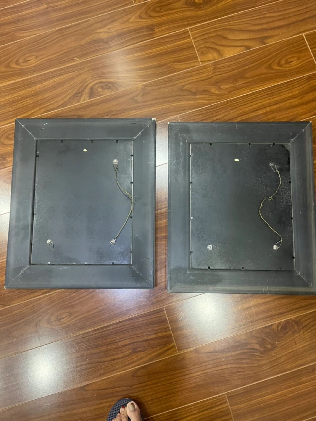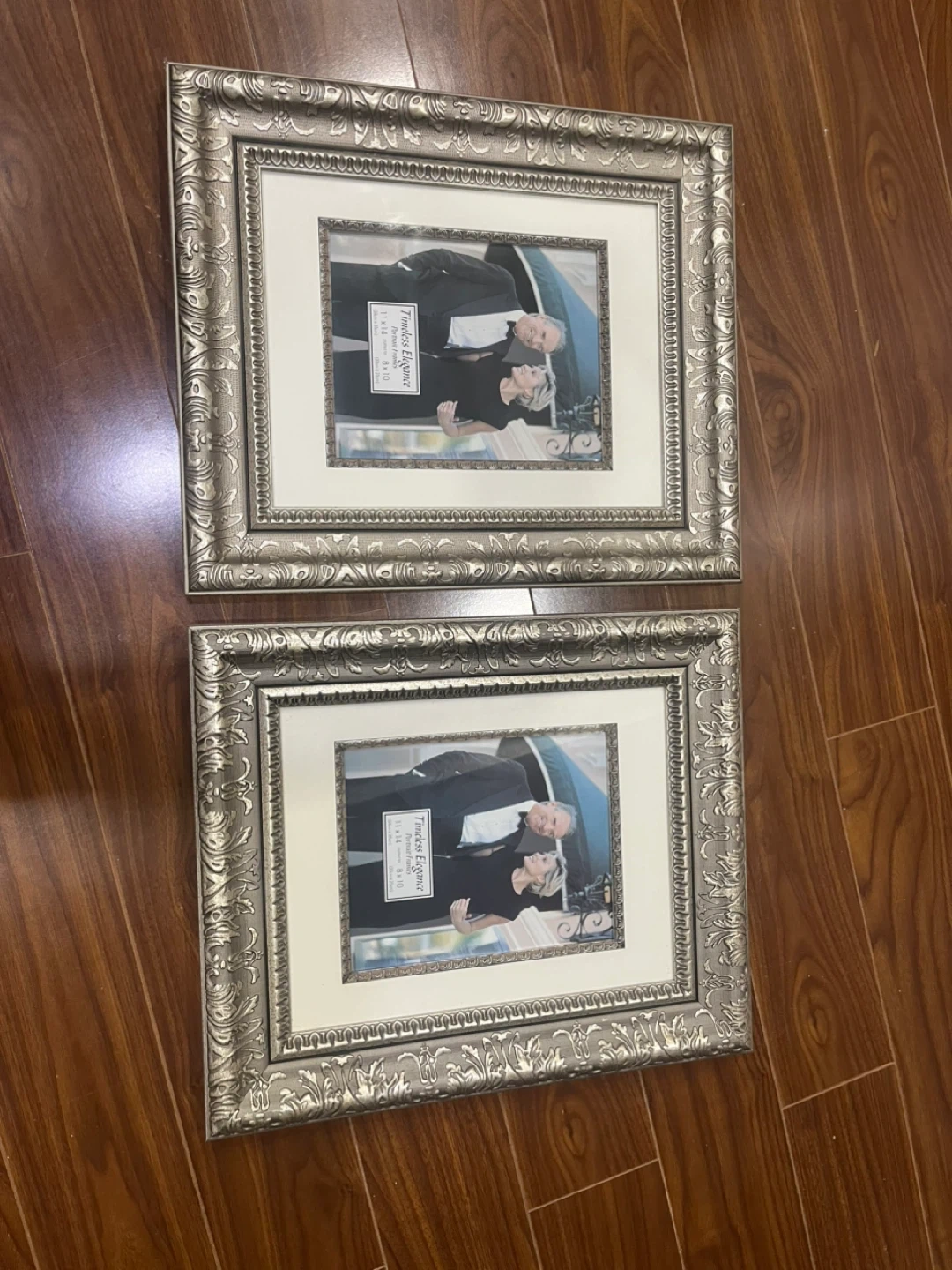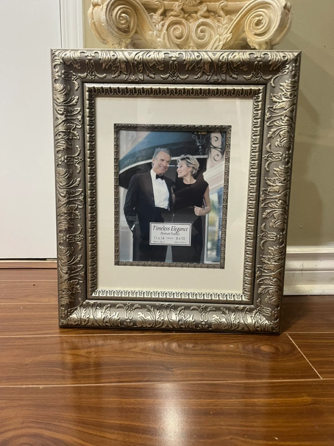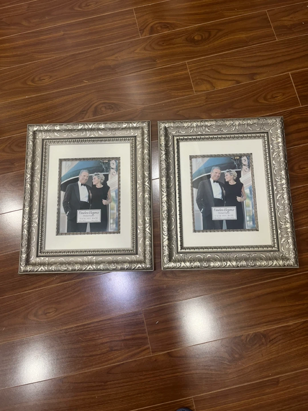 These are two silver photo frames with an ornate design. Each frame fits an 11x14 inch photo with a mat for an 8x10 inch picture. They're perfect for displaying cherished memories!