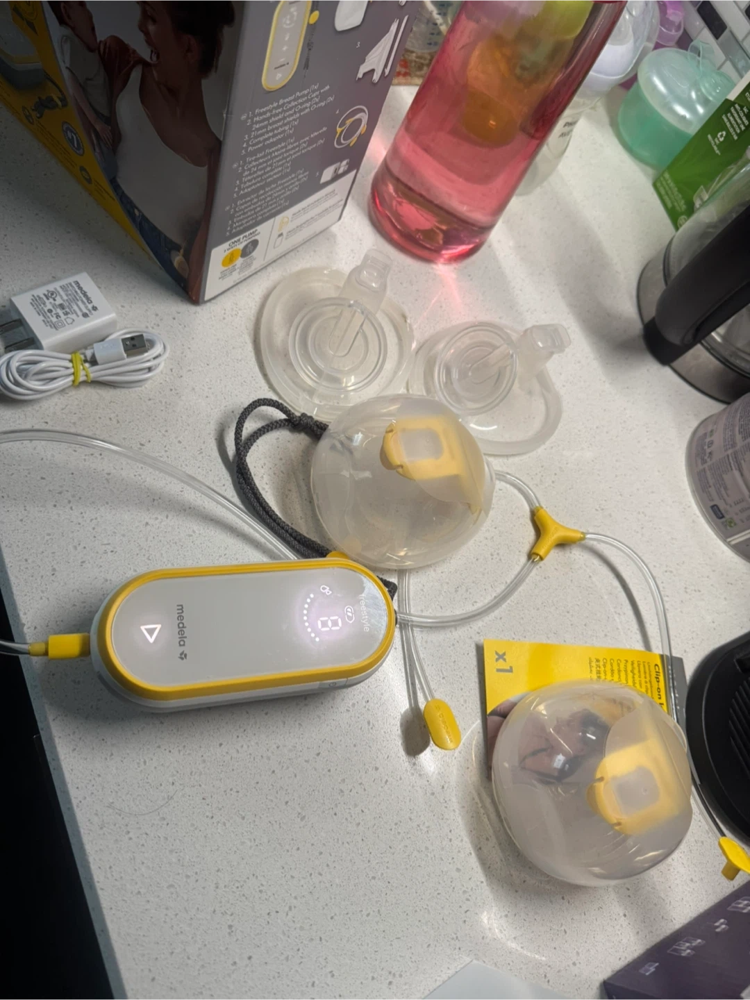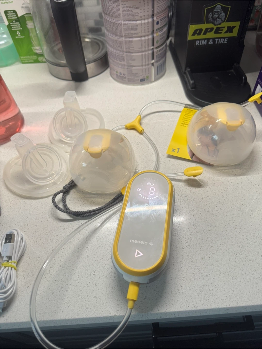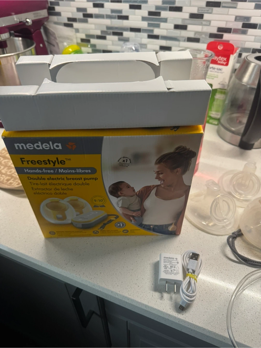 This is a Medela Freestyle double electric breast pump. It includes two breast shields and a USB charging cable. The digital display shows pump settings.
