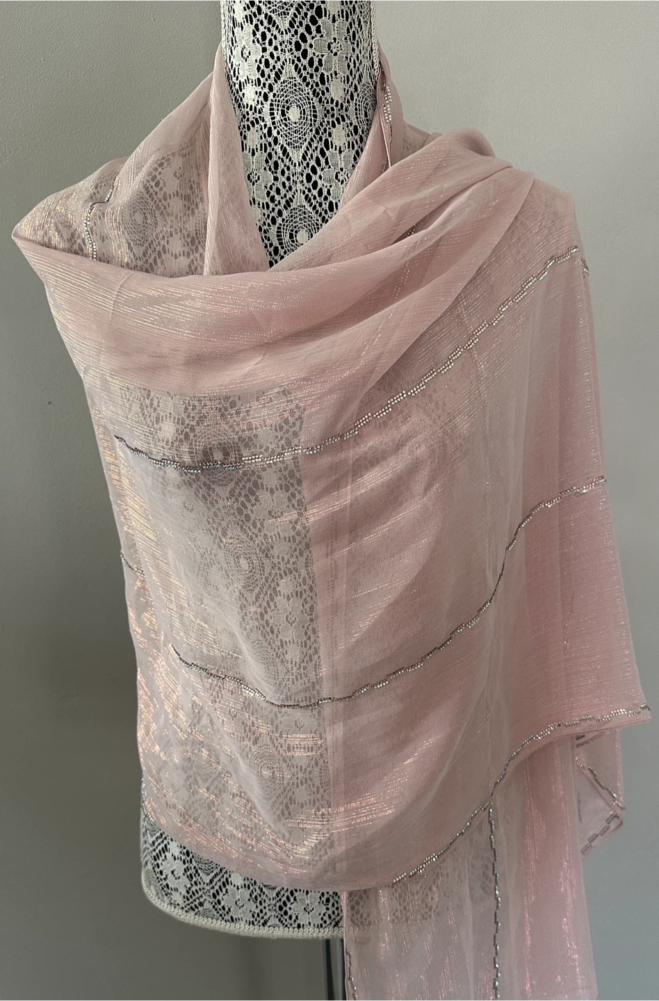 A lovely light pink scarf with rows of sparkling embellishments. It's lightweight and has a delicate shimmer. This scarf adds a touch of elegance to any outfit!