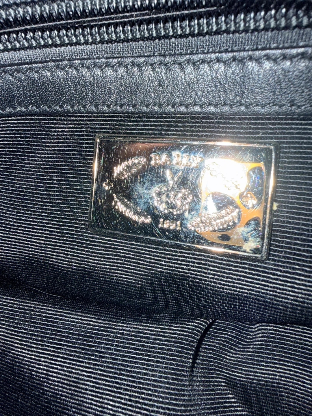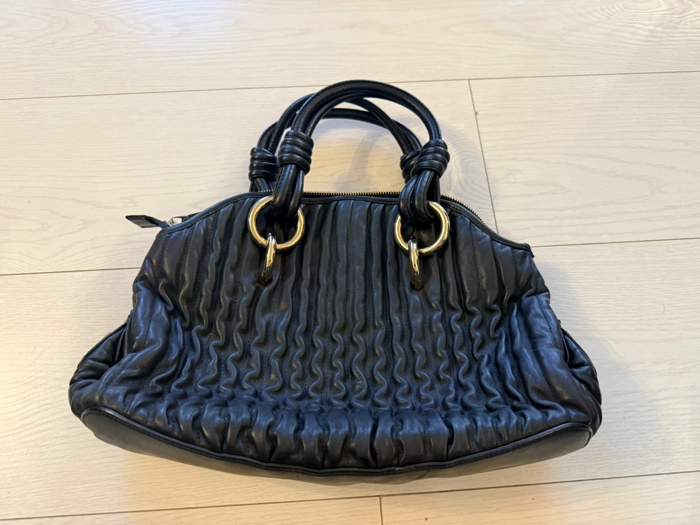 High quality. This is a black leather handbag by Bally. It features ruched detailing and gold-tone hardware. The interior has a branded plaque.