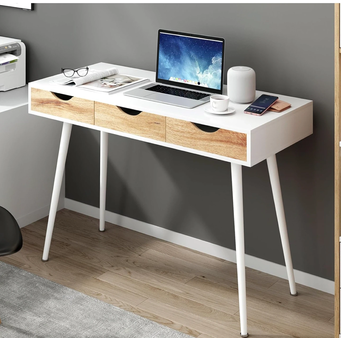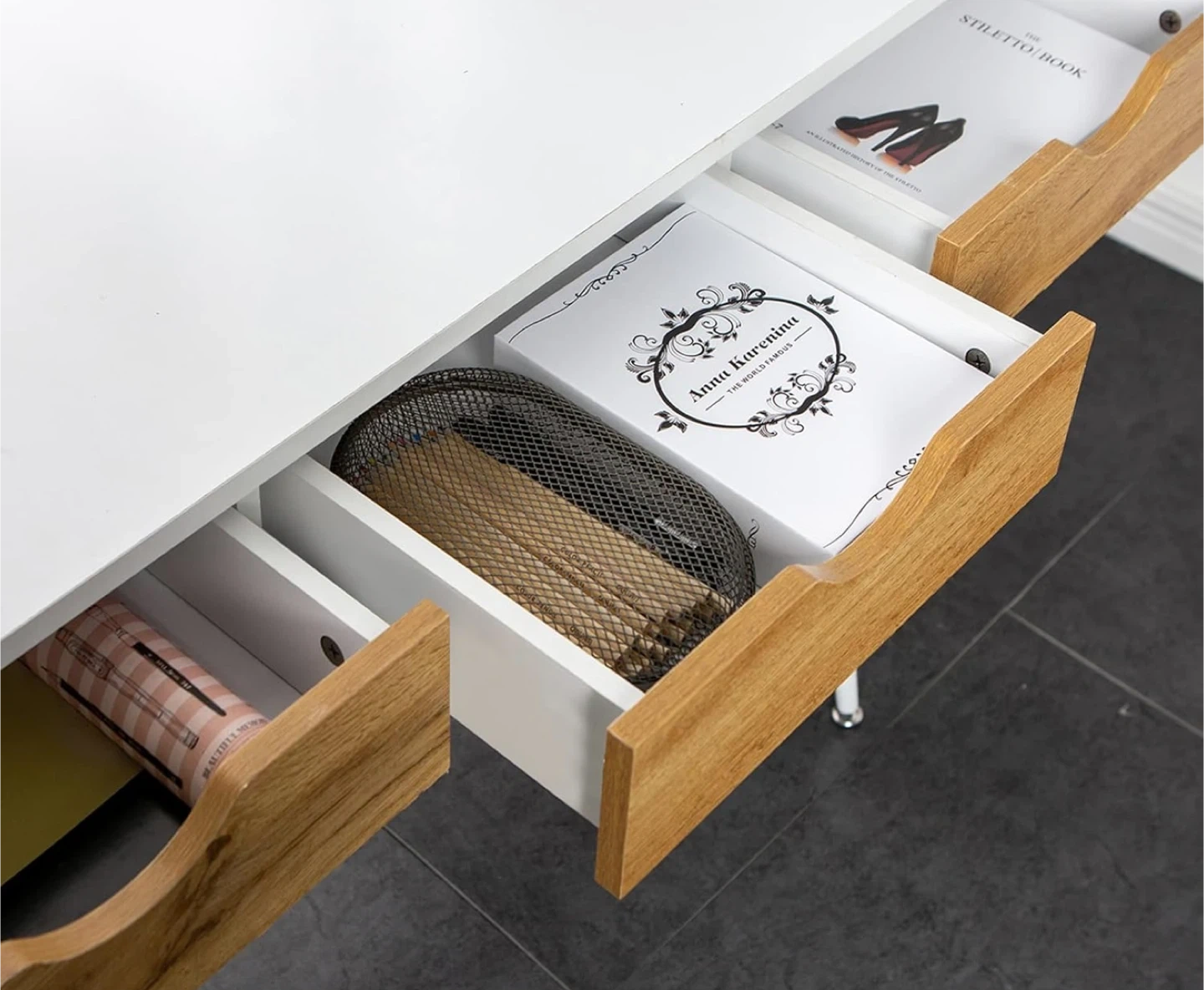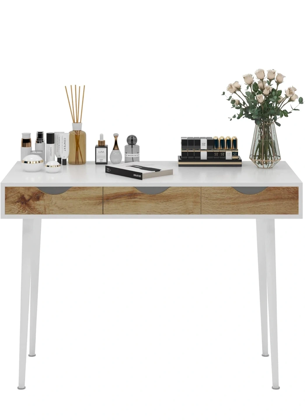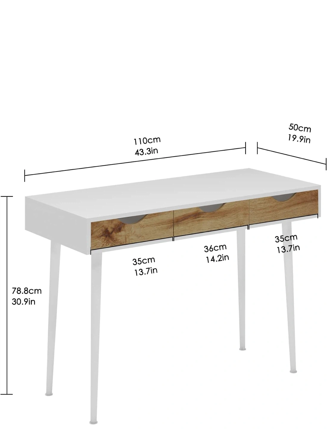 This desk features a clean white finish with three wood-grain drawer fronts. It has a sturdy base with adjustable feet. The overall dimensions are 110cm wide, 50cm deep, and 78.8cm high.