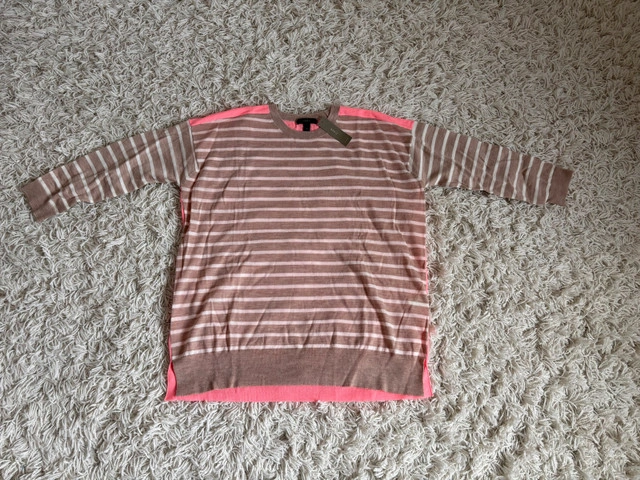 28Beautiful colour block stripped light sweater that can be layered or worn alone. Stripe pattern in the front and the sleeves. Pink colour on the back. Sleeves are 3/4 length. Crew neck. It’s a baggy style and doesn’t hug the body. Size Medium 100% Merino wool - it’s super soft. Brand new with tag and in original packaging.