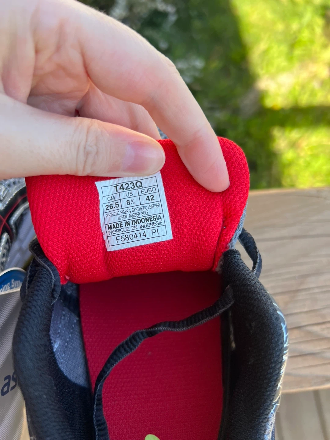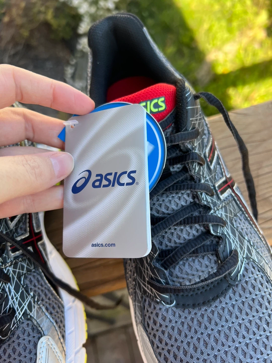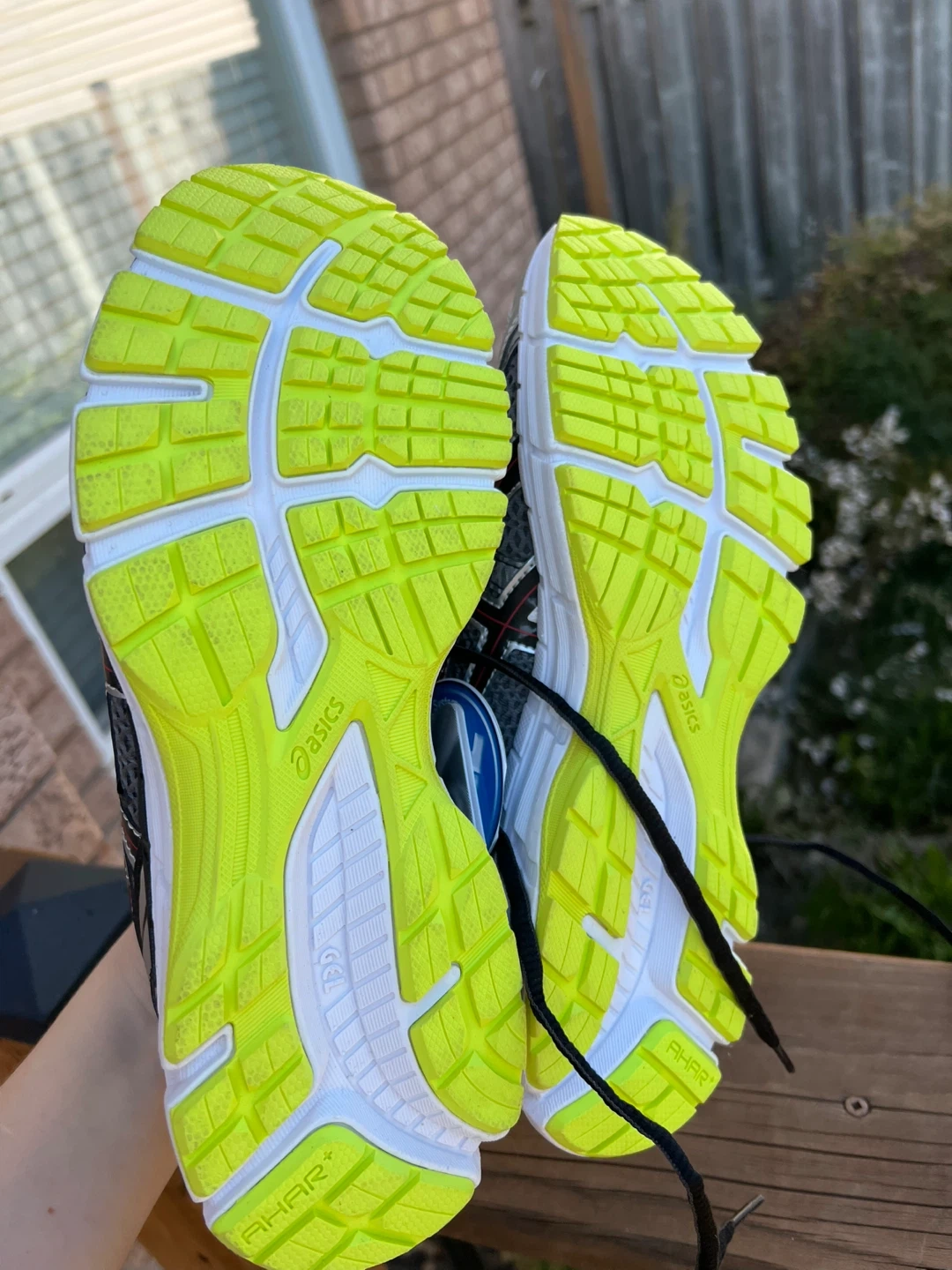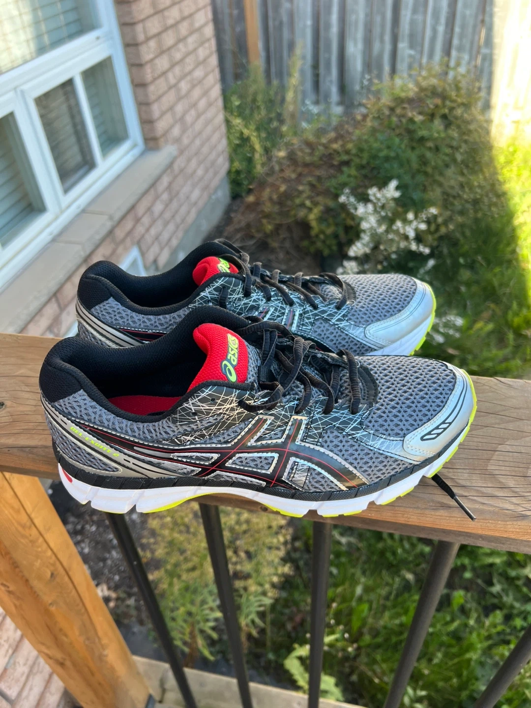 Selling a pair of Asics running shoes, size US 8.5! They are brand new with tags! The shoes feature a stylish grey and black design with a vibrant yellow sole.