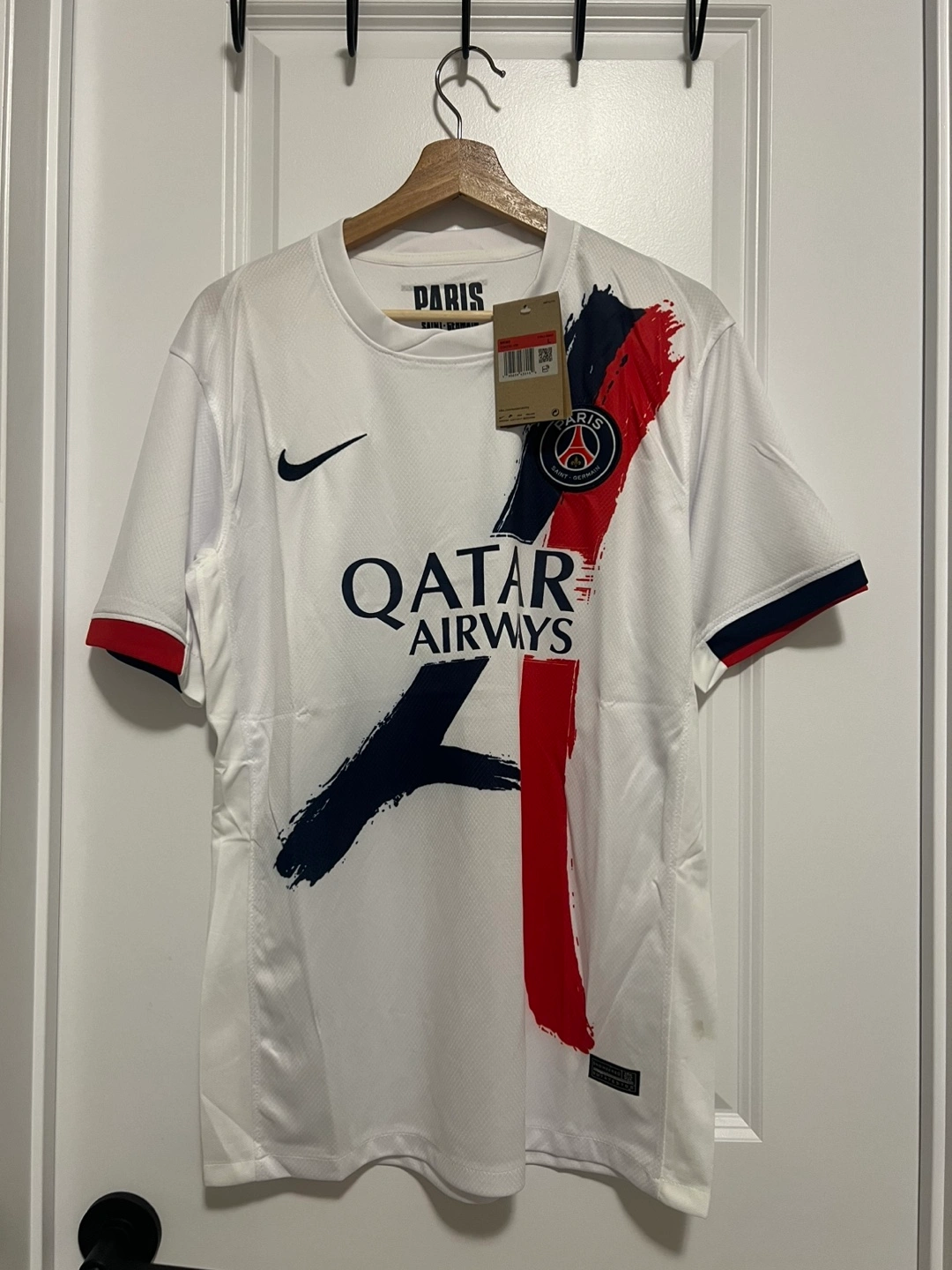 Brand new with tags! **my husband is an avid jersey collector, but selling some in excess as we are moving out. Paris Saint-Germain 2025 away white soccer Nike jersey. Men size Large. Pick up at: - Vaughan: Major Mac & Weston (flexible) Alternatively at: - North York: 404 & Finch (MON/TUE/THU 9-3pm) Or shipping (1-2 business days with tracking number): extra $8