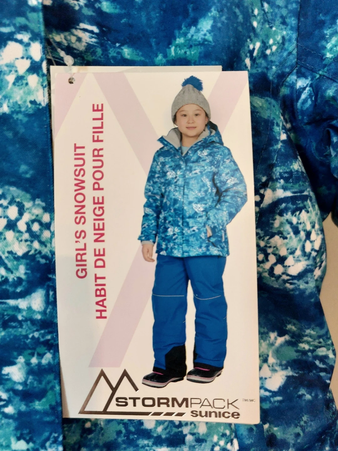15Brand new with tags. Selling a Stormpack girl's snowsuit in size 10! It features a stylish blue and white pattern on the jacket and solid blue pants. Perfect for keeping your little one warm and dry during winter activities!