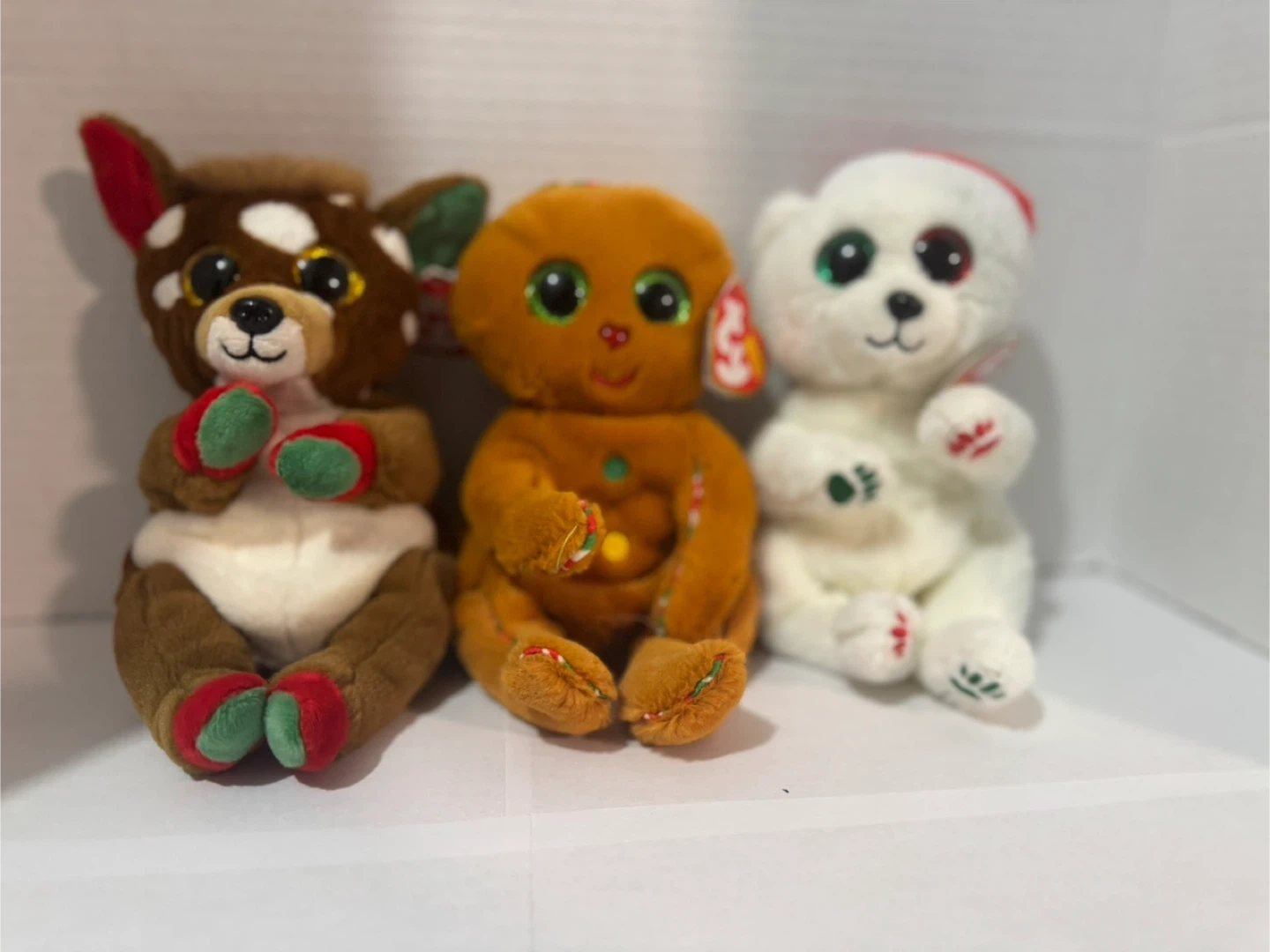 82Selling a set of three Ty Beanie Babies holiday-themed plush toys. Includes a reindeer, gingerbread man, and polar bear. These are in great condition and ready to add some festive cheer to your collection! $6/each