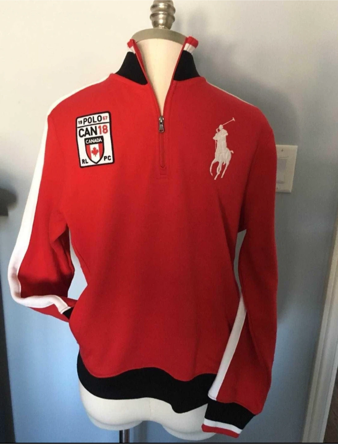 120Here's a BNWT YOUTH Size Large Polo Ralph Lauren pullover featuring the Canada emblem! It's red with white stripes on the sleeves and a black collar and hem. The iconic Polo player logo is embroidered on the chest