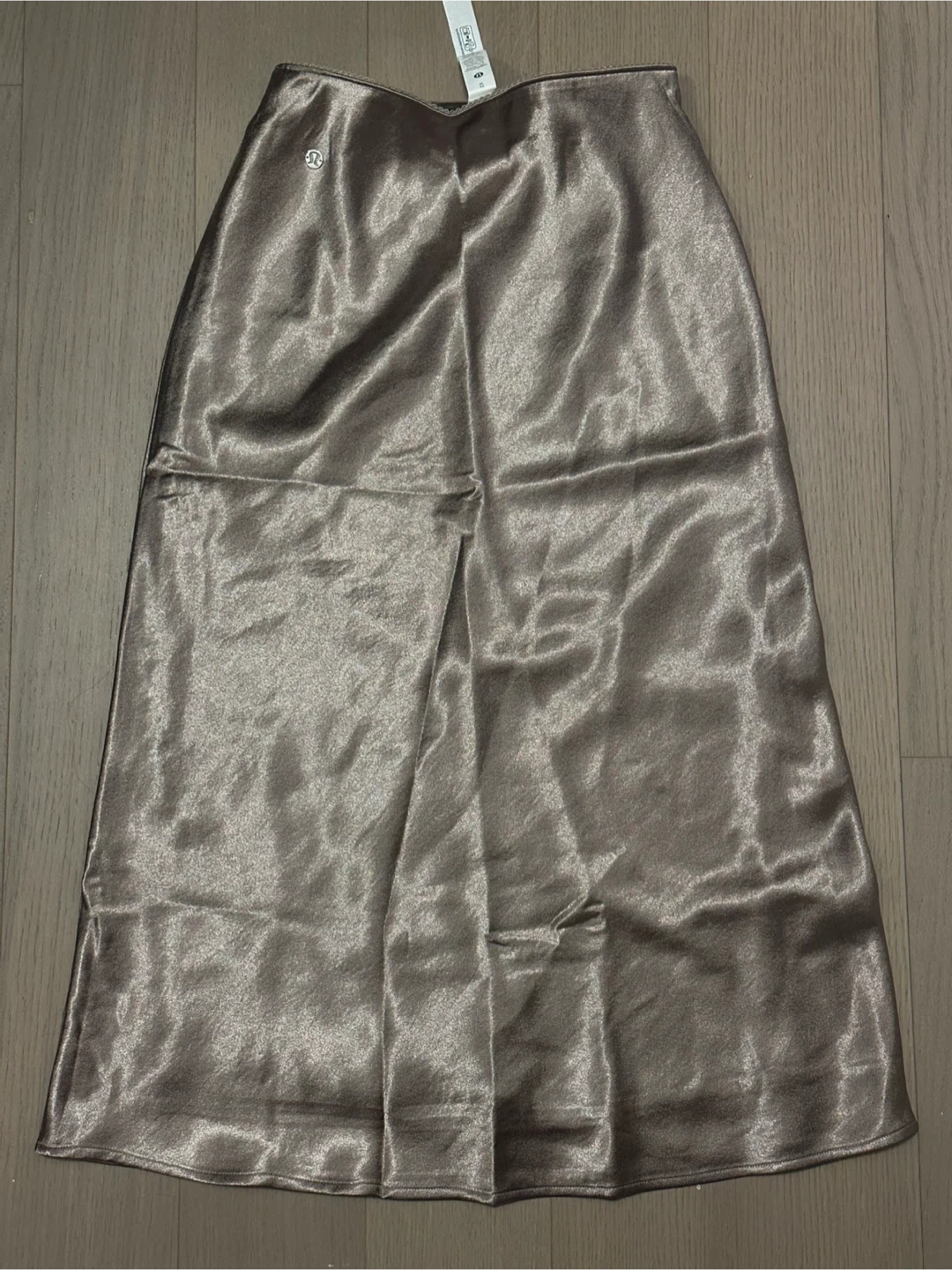 Never worn Lululemon gold satin midi skirt. Body: 100% Recycled Polyester. Lining: 100% Polyester. Size XS.