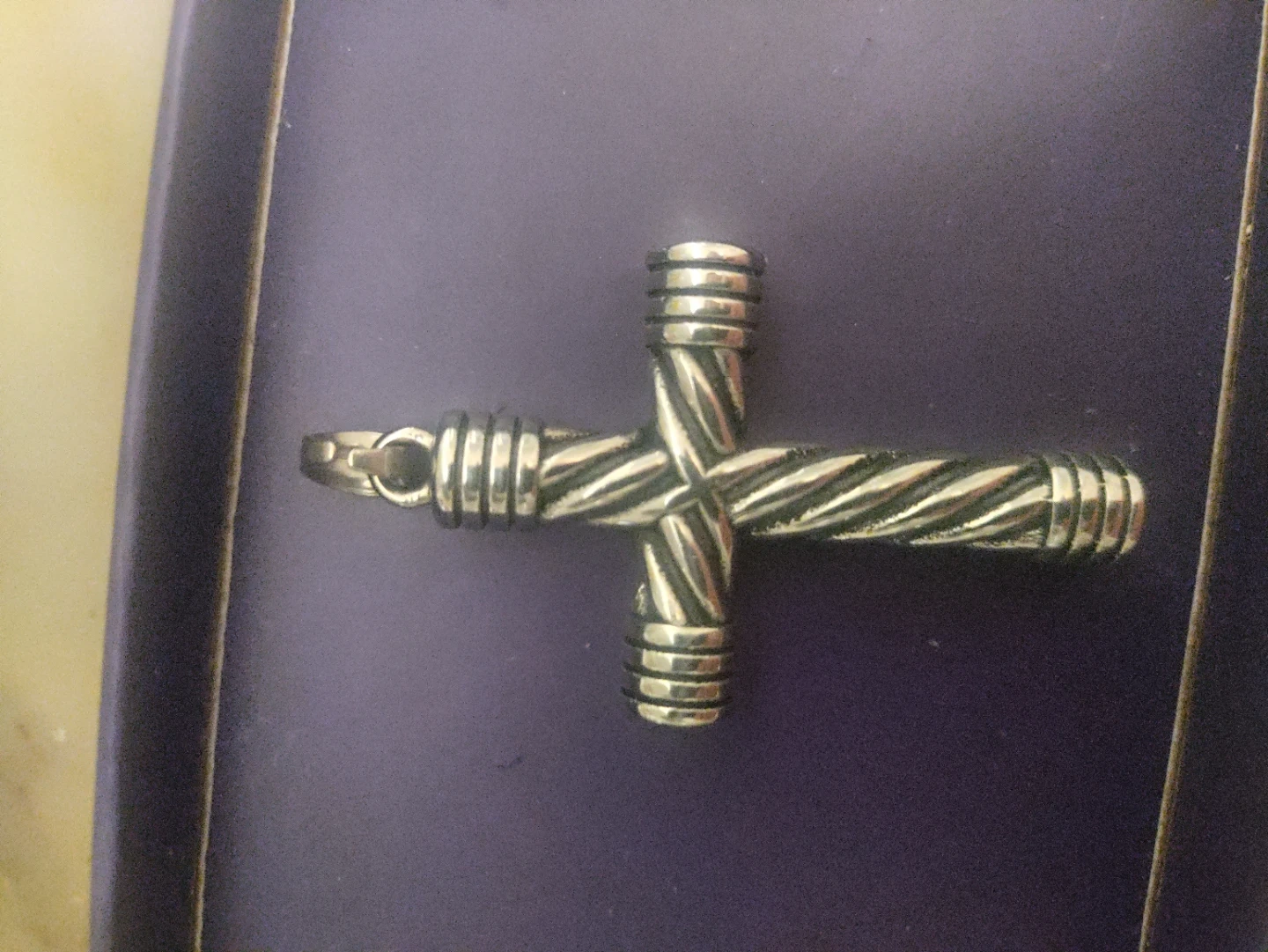 This cross pendant has a unique twisted rope design with ribbed accents on the ends. It's made of metal and has a silver-like finish. This piece would make a thoughtful gift or personal accessory.