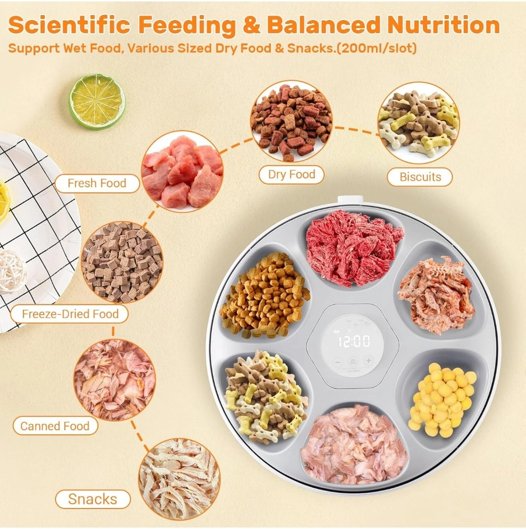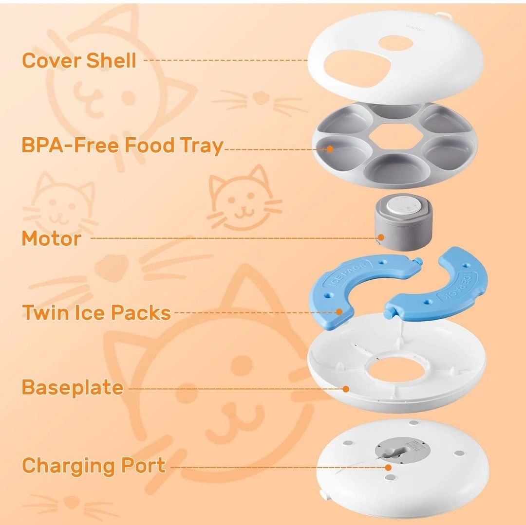 Selling a Gamkii automatic pet feeder! It's designed with a detachable food tray for easy cleaning. The feeder has a 3600mAh battery that lasts for 6-8 hours and provides up to 30 days of endurance time. It features 6 meal compartments and is suitable for both wet and dry food. Twin ice packs are included to keep the food fresh. The dimensions are 12.6" x 12.9" x 3.4".
