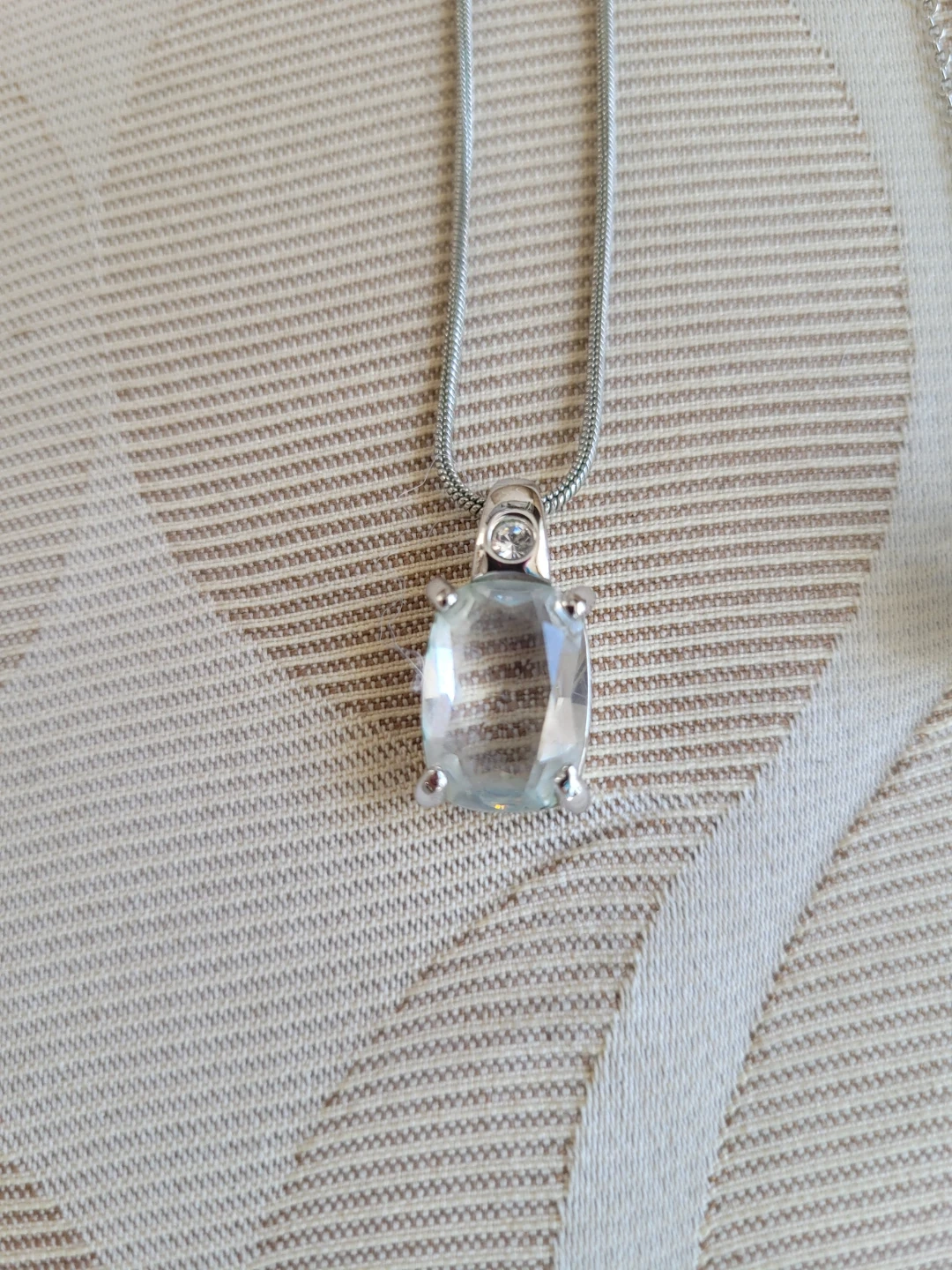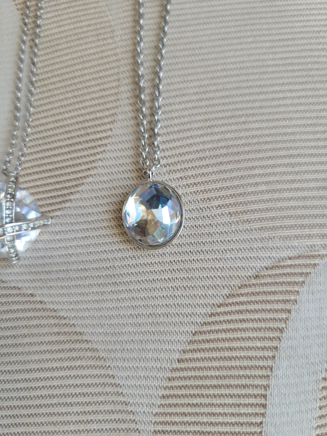 Three authentic Swarovski necklaces, each featuring a different pendant. One has a clear rectangular stone, another a round faceted crystal with a criss-cross design, (1 tiny crystal missing) and the third a smooth, iridescent circular stone. They all have trademark swan. They're perfect for adding a touch of sparkle to any outfit!