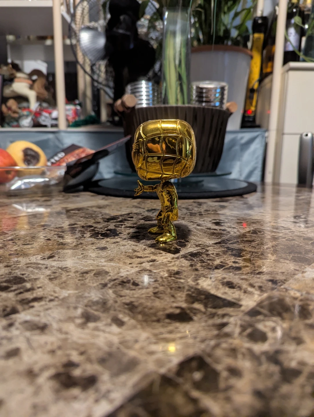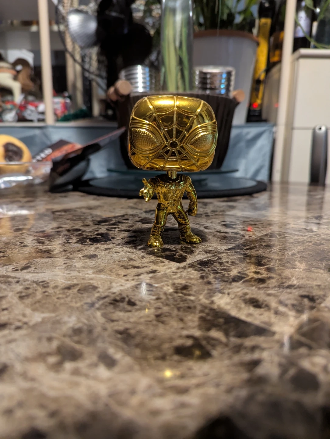 This is a Funko Pop! collectible figure of Spider-Man in a shiny gold finish. It's a great addition for any Marvel or Funko Pop! collector. Limited edition Funko, goes for $300+ with the box.