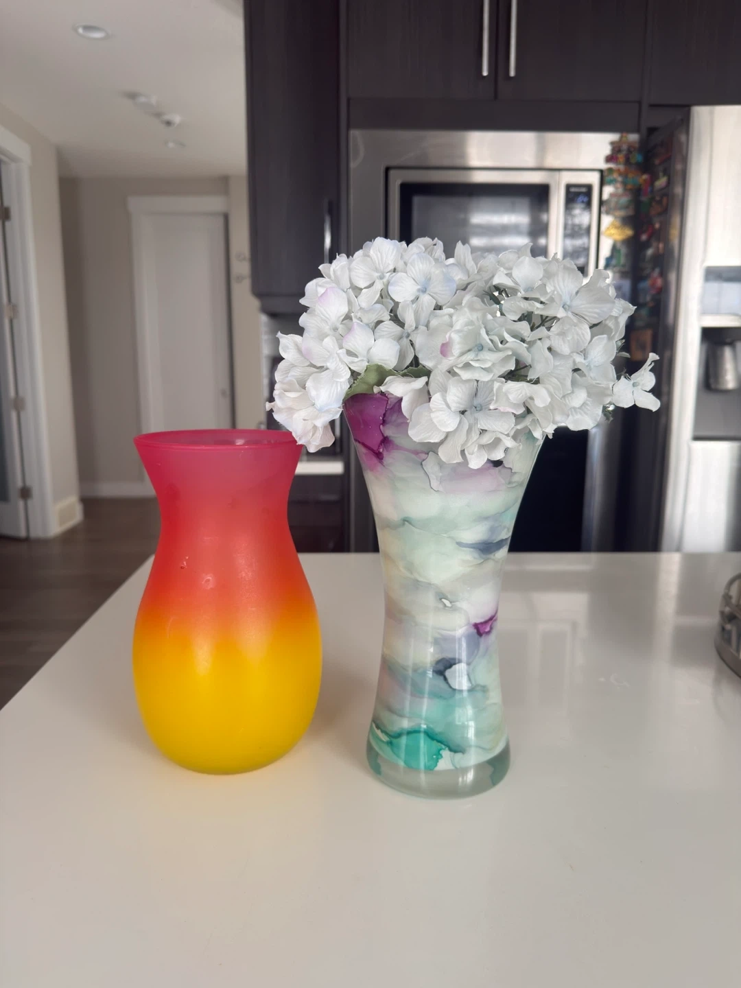 Two decorative glass vases, one with a sunset ombre finish in pink and yellow. The other features a marbled alcohol ink design in blues, greens, and purples. Both are ideal for displaying fresh or artificial flowers.