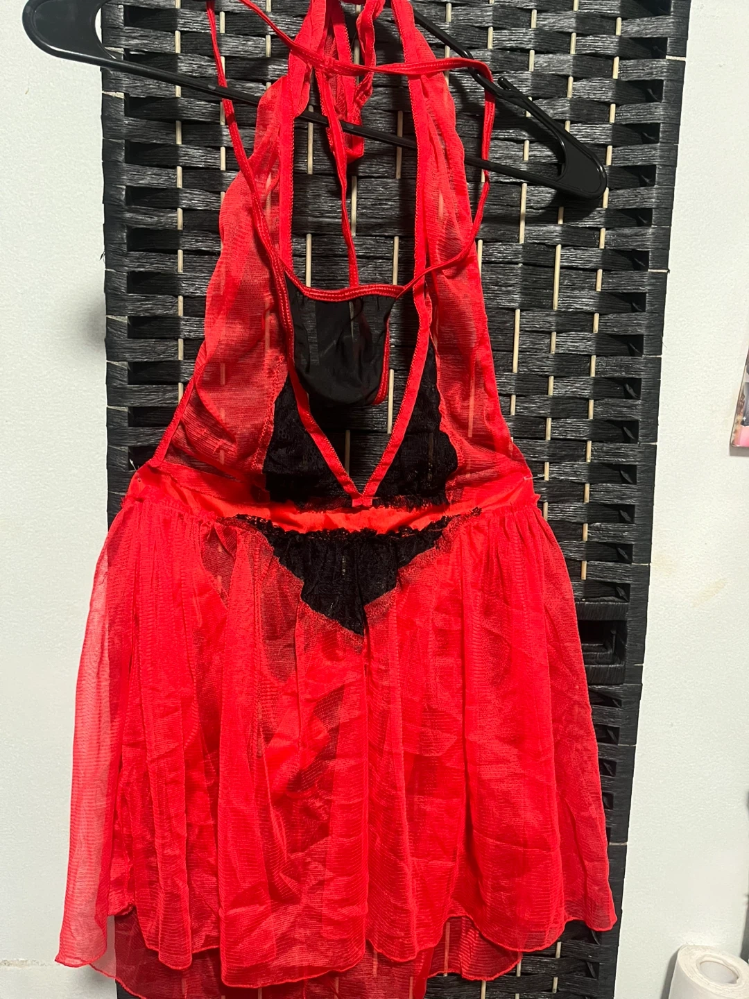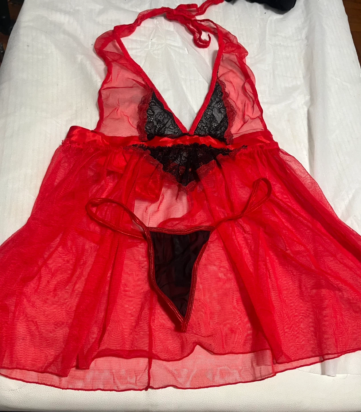 This red babydoll lingerie set features delicate black lace detailing on the bust and a sheer, flowing skirt. It includes a matching G-string for a complete look. The halter neck tie ensures adjustable and comfortable wear. Perfect for a special occasion or everyday luxury!