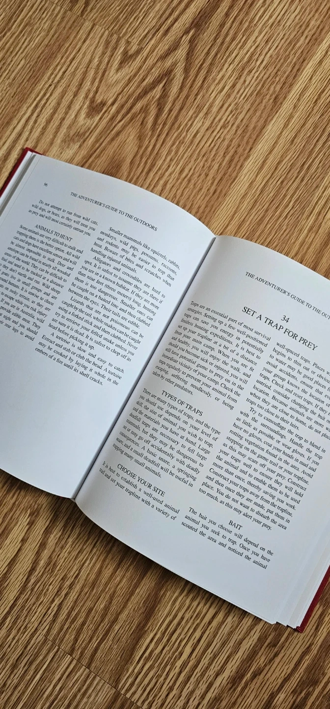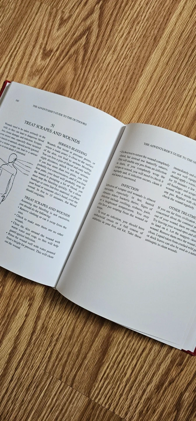 This book covers 100 essential skills for surviving in the wild. It details topics like treating scrapes and wounds, handling infections, and setting traps. Navigation basics with compasses and maps are also explained.