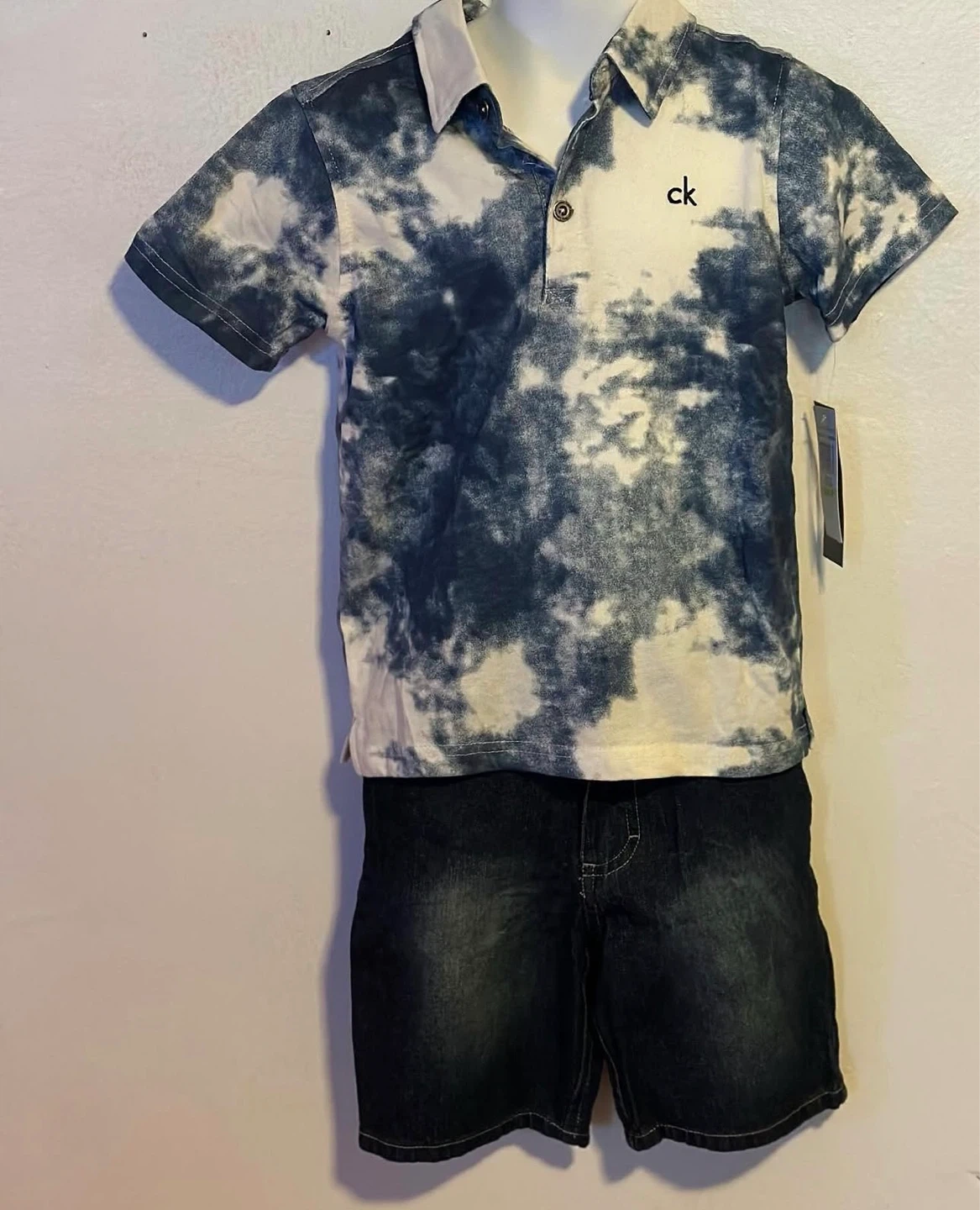 This cool Calvin Klein outfit features a stylish tie-dye polo shirt and dark denim shorts, perfect for your little dude. The is new with tags and ready for some summer fun!