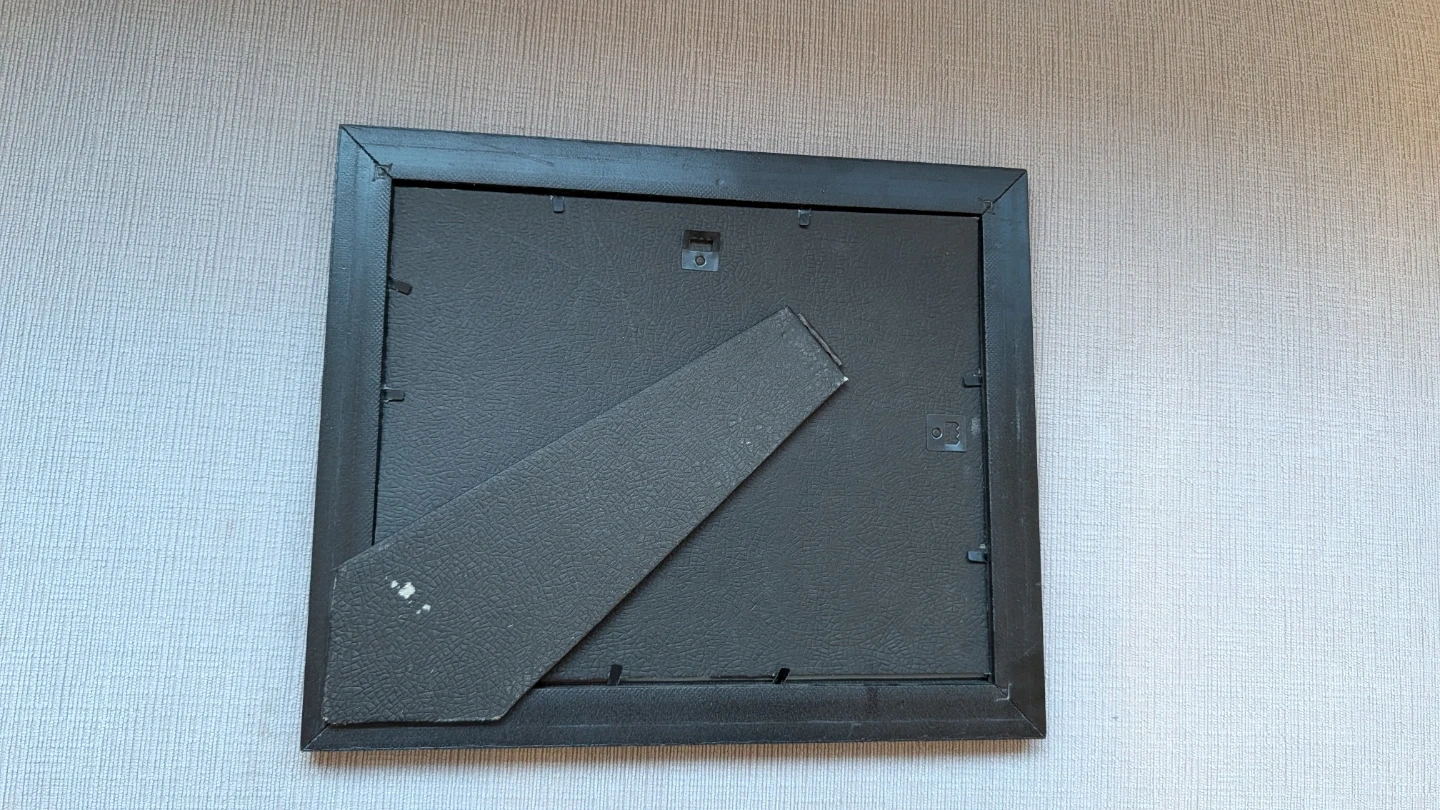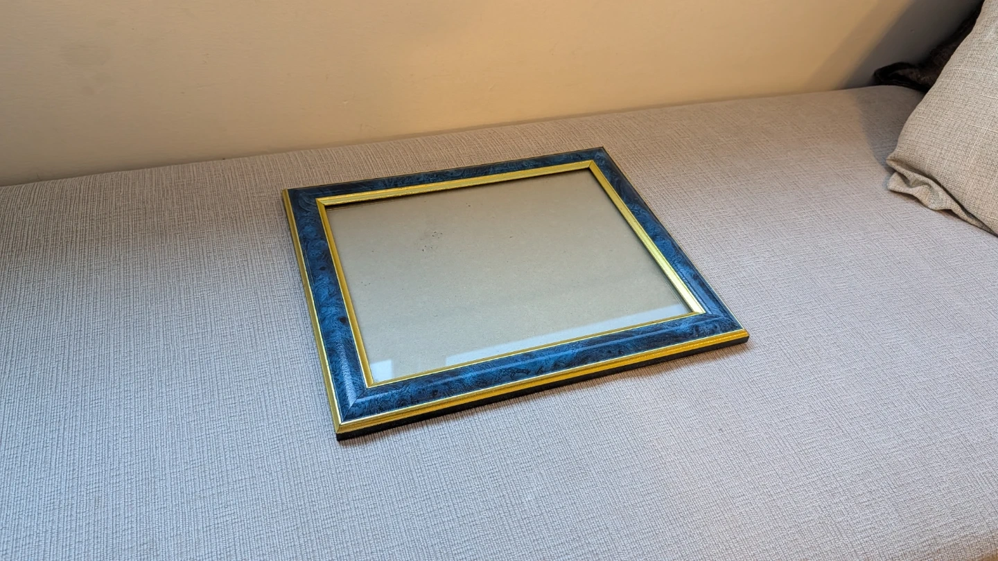 A decorative picture frame with a blue and gold finish. It can stand on its own or be hung on a wall. Glass front is included.