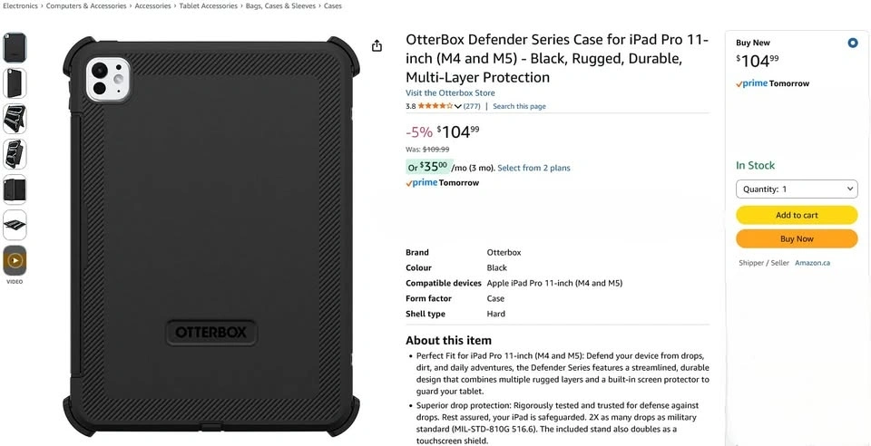 NEW in package. Model# 77-95237. This Defender Series case is a perfect fit for iPad Pro 11-inch (M4 and M5), designed to defend your device from drops, dirt, and daily adventures. It features a streamlined, durable design with multiple rugged layers and a built-in screen protector. Superior drop protection, tested to withstand 2X as many drops as military standard (MIL-STD-810G 516.6). The included stand doubles as a touchscreen shield. The case has a hard internal shell, a soft outer slipcover, and a built-in screen protector. Port covers block dust and dirt. The versatile four-position stand allows for comfortable typing, media viewing, portrait interaction, and landscape streaming. Includes convenient Apple Pencil storage and two lanyard attach points. Trusted OtterBox quality for peace of mind.