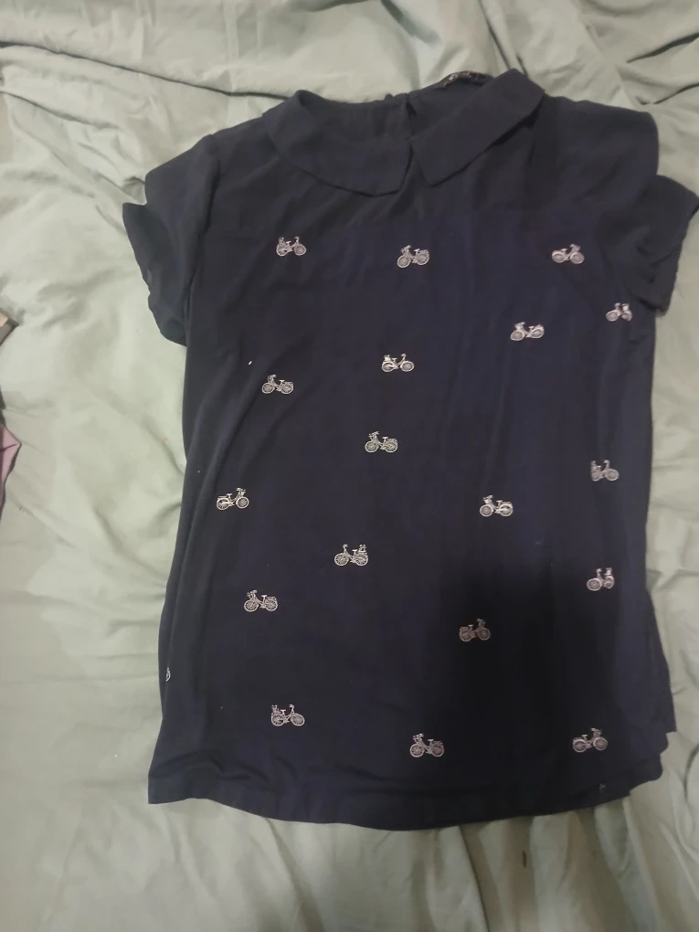 Cute RW&CO. blouse in navy blue with an all-over bicycle print! It's a size medium and has a peter pan collar. Perfect for adding a touch of whimsy to your wardrobe