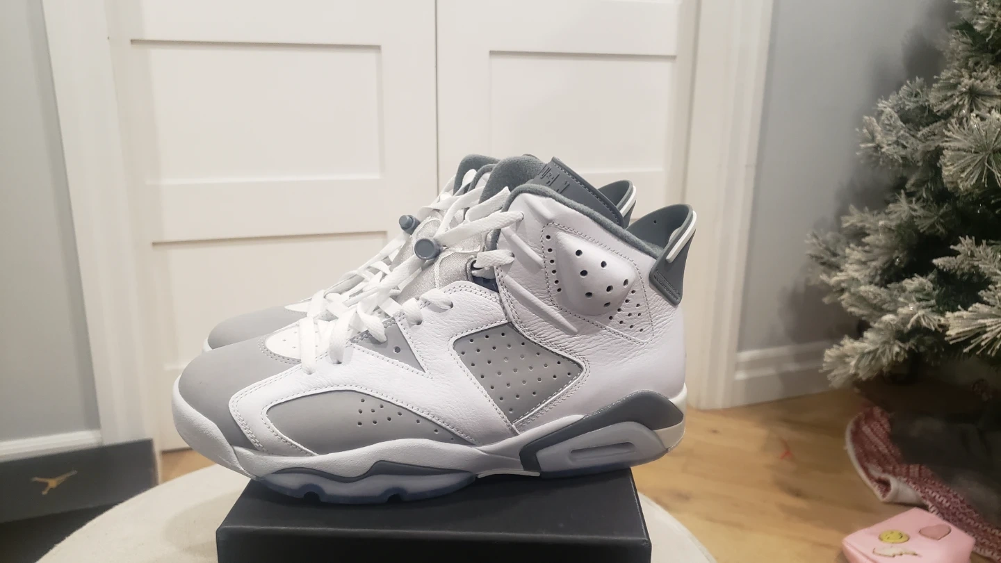Selling a pair of Air Jordan 6 Retro sneakers in white and cool grey. These classic kicks are brand new and have never been worn.