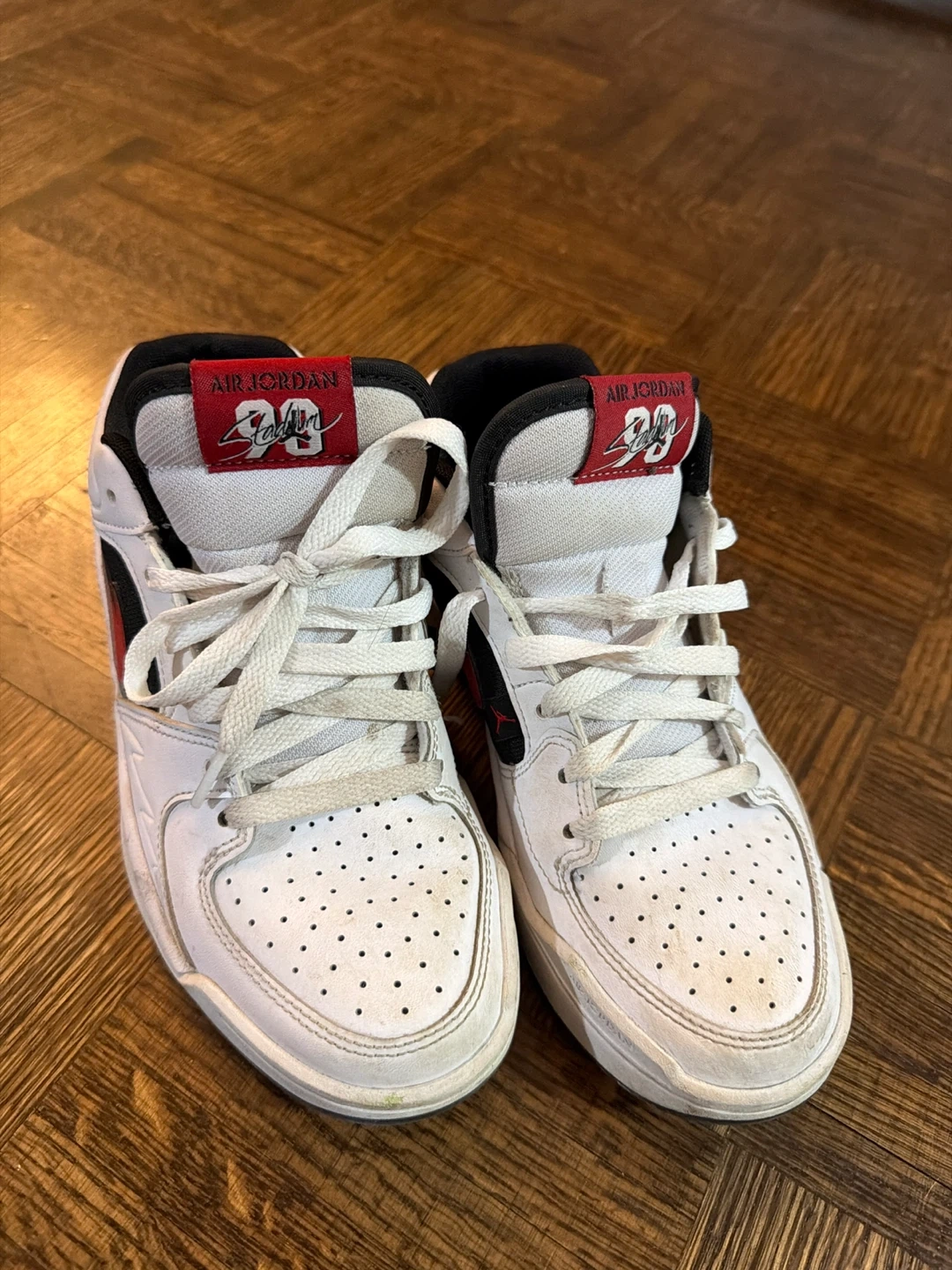 A pair of Nike Air Jordan 1 Mid sneakers in white, red, and black. These shoes are white with red and black accents, featuring the iconic Air Jordan branding on the tongue. They're great for everyday wear.