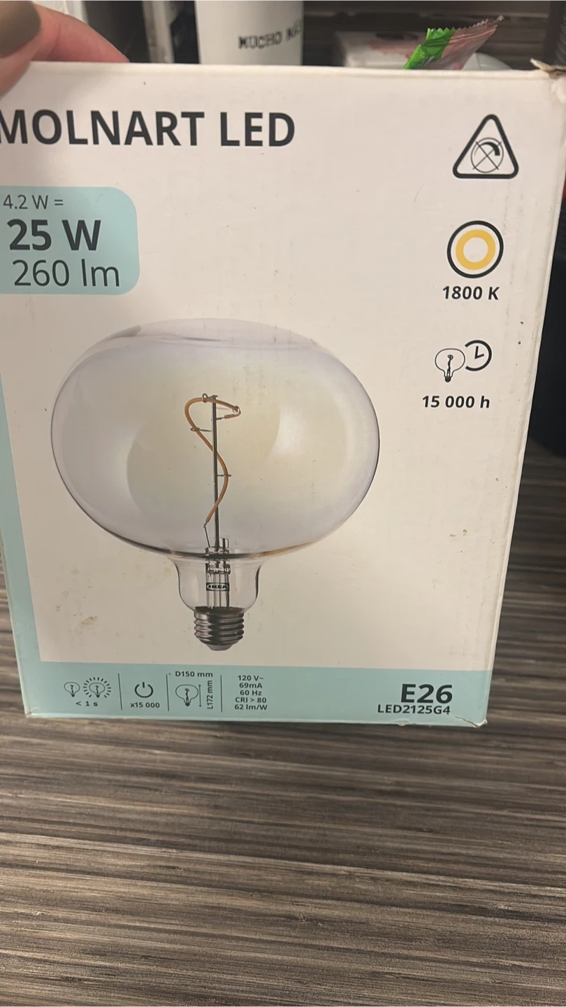 This MOLNART LED light bulb uses 4.2 W and produces 260 lumens. It has a lifespan of 15,000 hours and a color temperature of 1800 K. The bulb features an E26 base and a diameter of 150 mm. It's a decorative bulb designed for specific lighting applications.