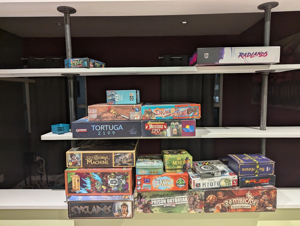 Make me a trade for any game Check out my want list, and I am open to games that aren't on my list. Top shelf: Tiny Epic Zombies (brand new condition) Radlands superdeluxe version (great condition) Middle shelf: Pax Transhumanity (brand new) Raiders of Scythia (good condition inside but some wear and tear on the box) Tortuga 2199 (a bit of box damage but unplayed) Messina 1347 (a bit of damage to the box on top) The Great Dragon Race (brand new) Nexus Ops (good condition) Bottom shelf: City of the Great Machine (played once, brand new) Quests and Cannon (great condition) Cyclades (good condition inside, some wear and tear on the box) Lost in R'lyeh (good condition) Money! (Great condition) Yokohama (great condition) Zombicide Season 2: Prison Break Fluxx (fair condition) Kyoto (great condition) Zombicide: The Black Plague (good condition) Saboteur anniversary edition (good condition) Fuse (good condition) Want list Brass: lancashire Blood on the clocktower Endeavor: Age of sail Endeavor: Deep Sea Nemesis Kyoto No Neko Shikoku legendary Inventors Civilization A New Dawn 6 Siege Heat: Pedal to the metal Blood rage
