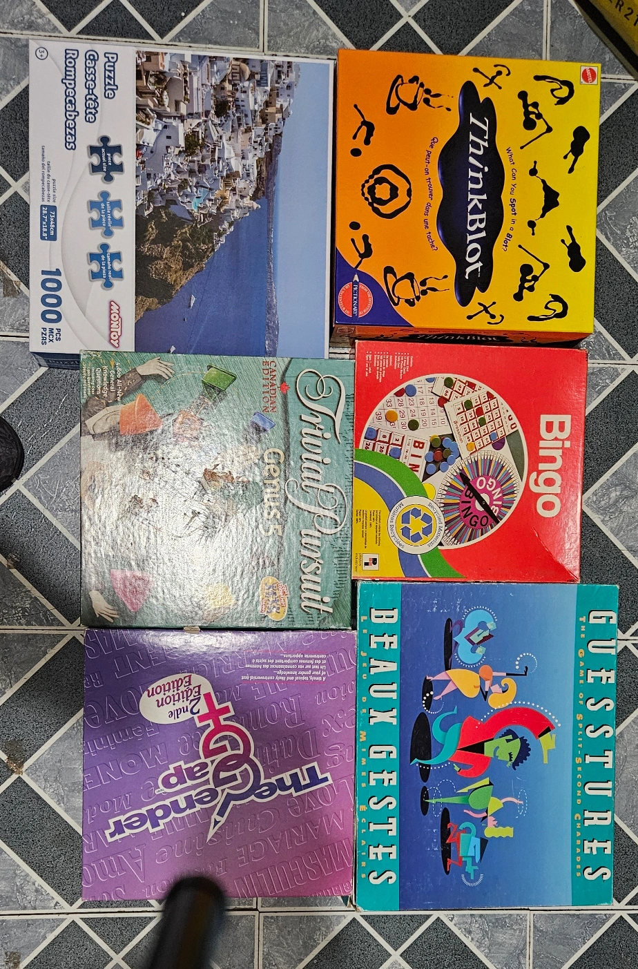 Selling a collection of fun board games! Includes: - Trivial Pursuit Canadian Edition Genus 5 - Bingo - Guesstures: The Game of Split-Second Charades - ThinkBlot - The Gender Game 2nd edition - A 1000 piece puzzle