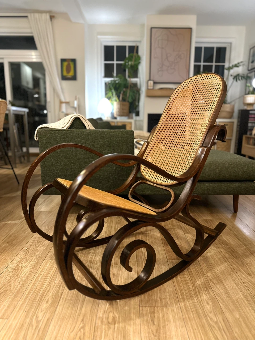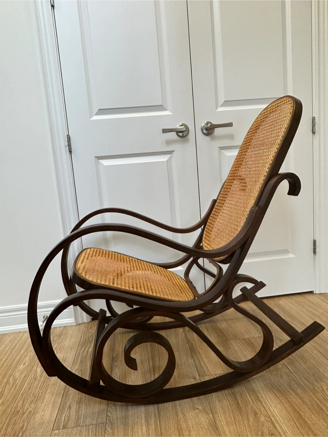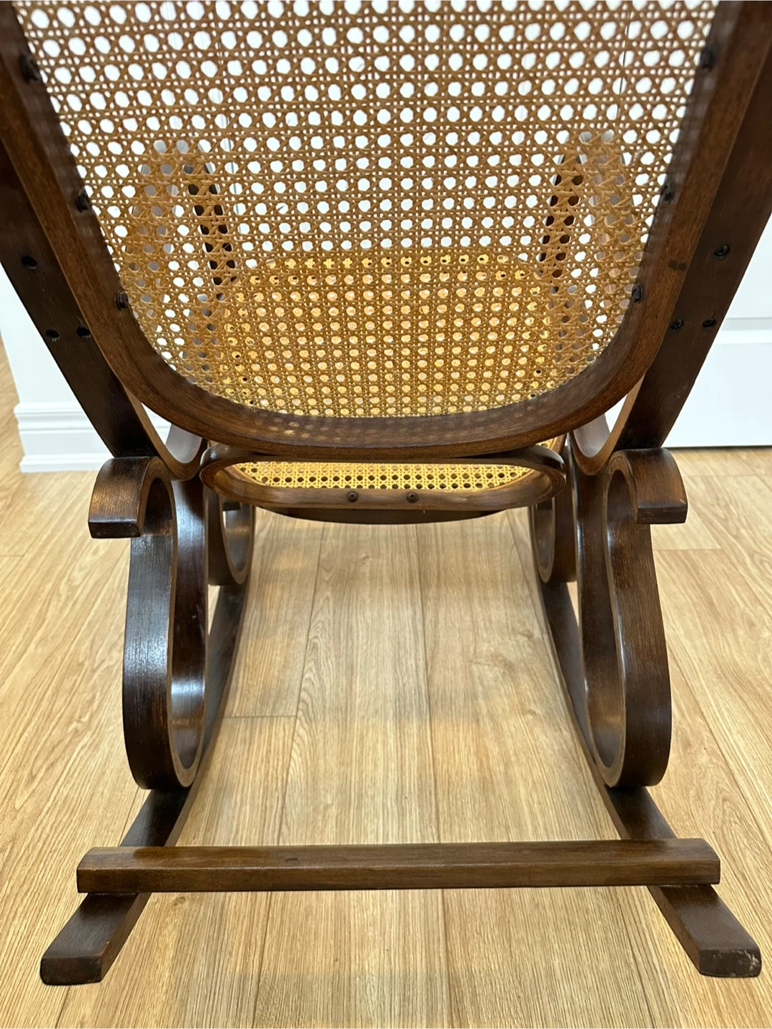 A classic bentwood rocking chair with a woven cane seat and back. It’s in impeccable condition. It's finished in a dark stain, showcasing its elegant curves. This chair would be a lovely addition to any cozy nook!