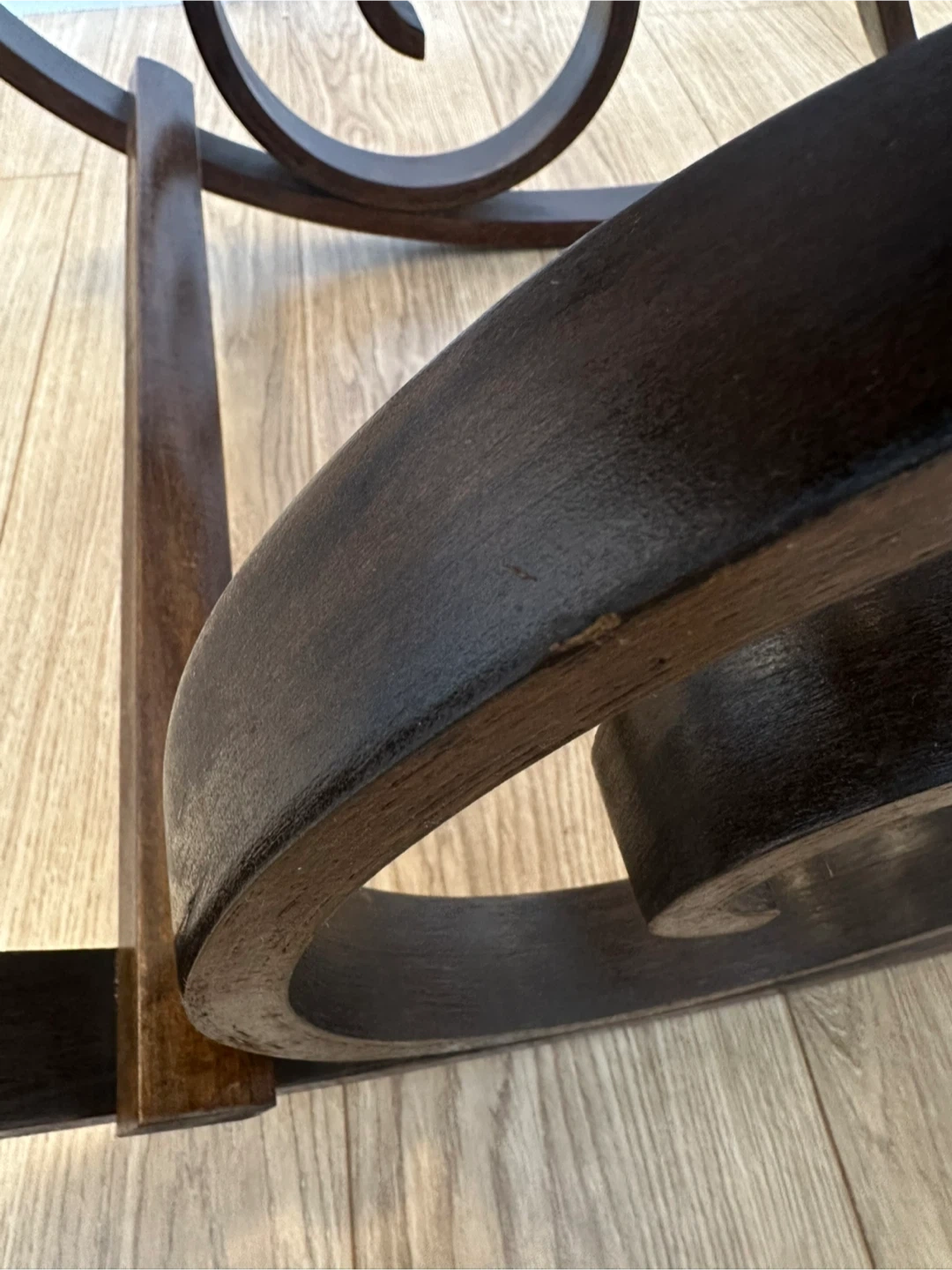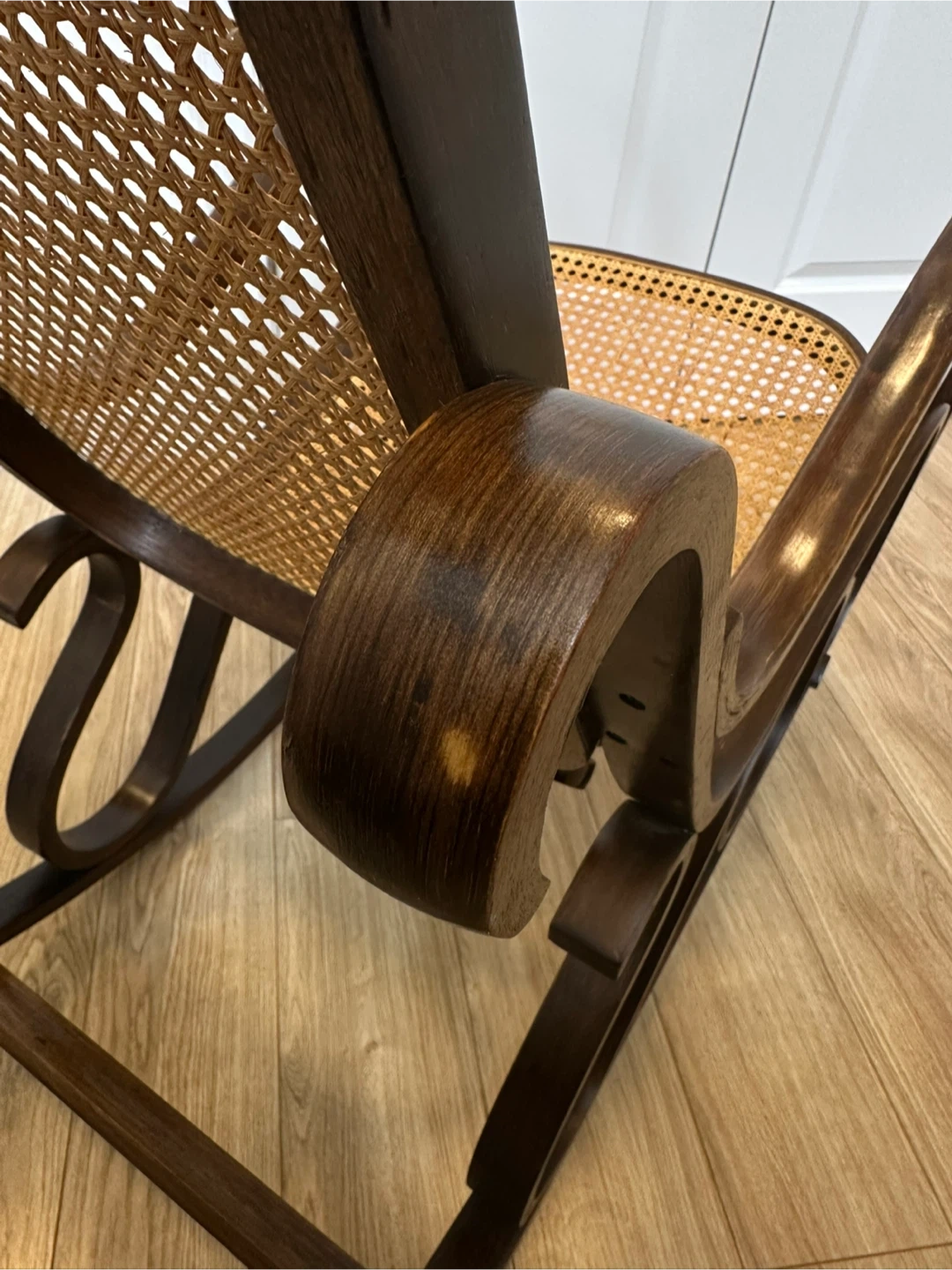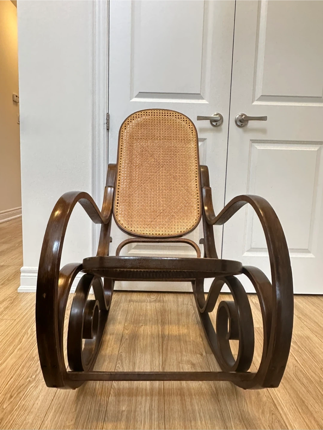 A classic bentwood rocking chair with a woven cane seat and back. It’s in impeccable condition. It's finished in a dark stain, showcasing its elegant curves. This chair would be a lovely addition to any cozy nook!