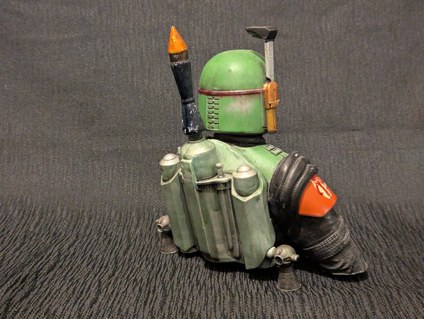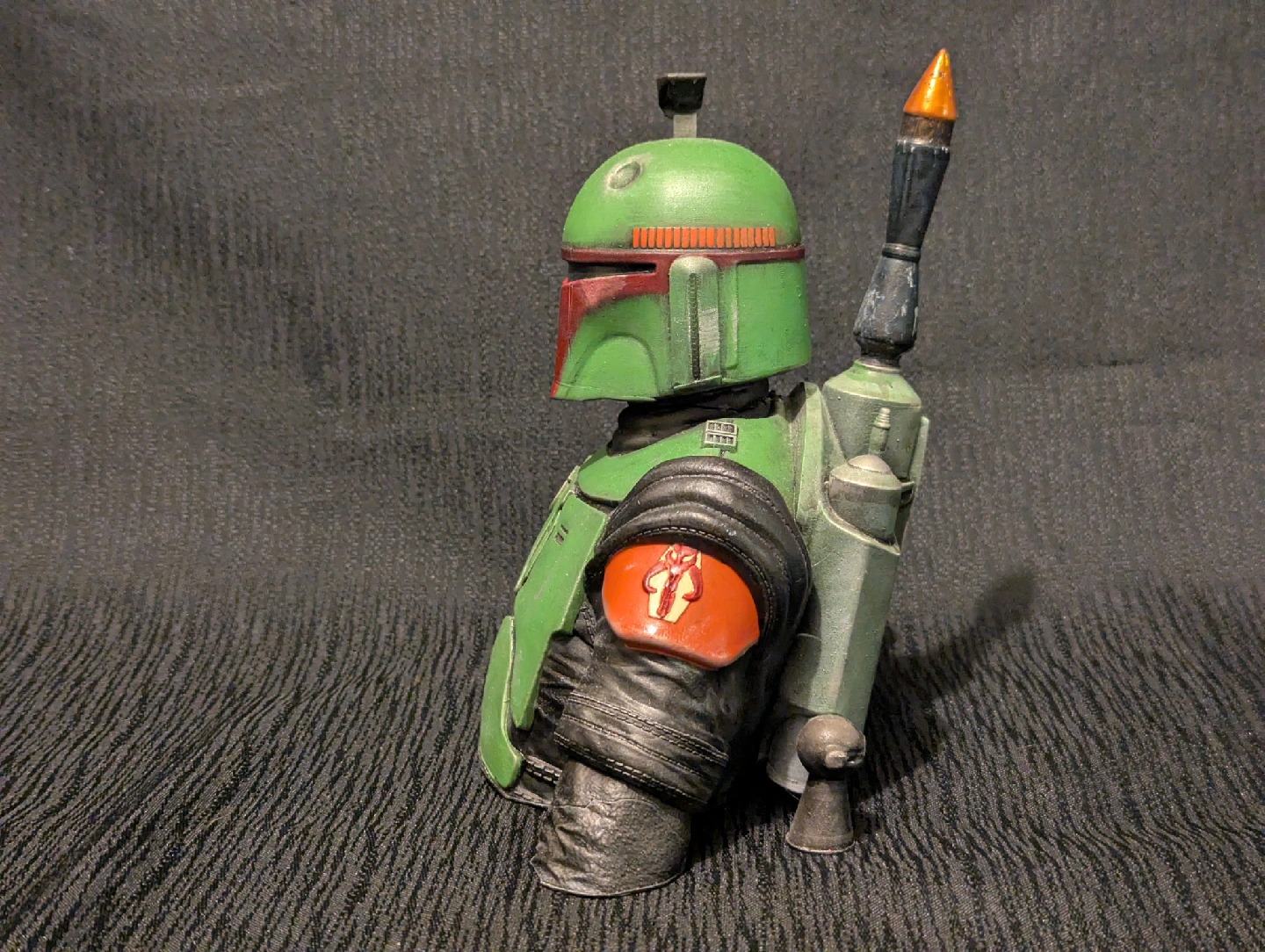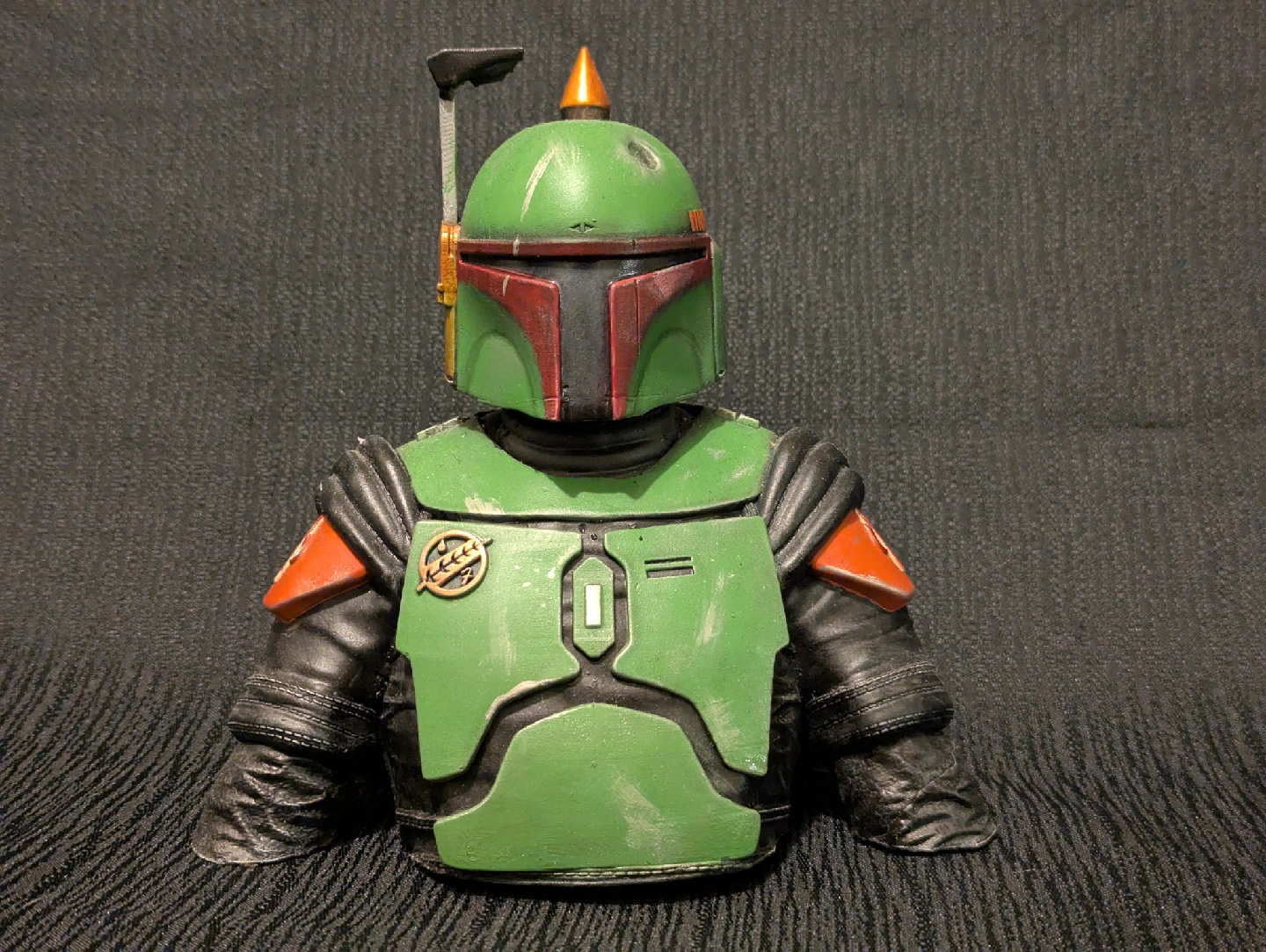 76Selling a Boba Fett bust from Star Wars! It's in great shape and would be perfect for any Star Wars fan or collector. It stands 7 1/2 inches tall from table to tip of the rocket, making it a cool display piece for your home or office. 3D printed from resin and hand painted by me.