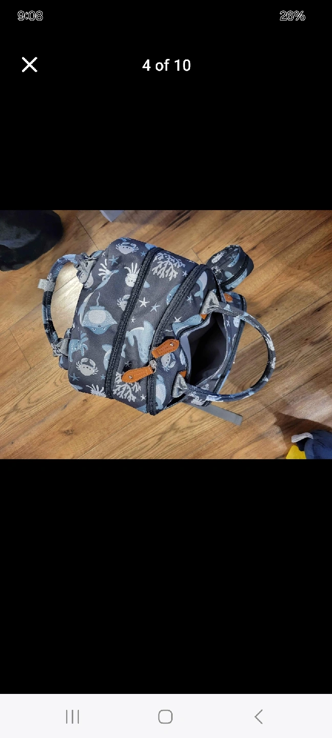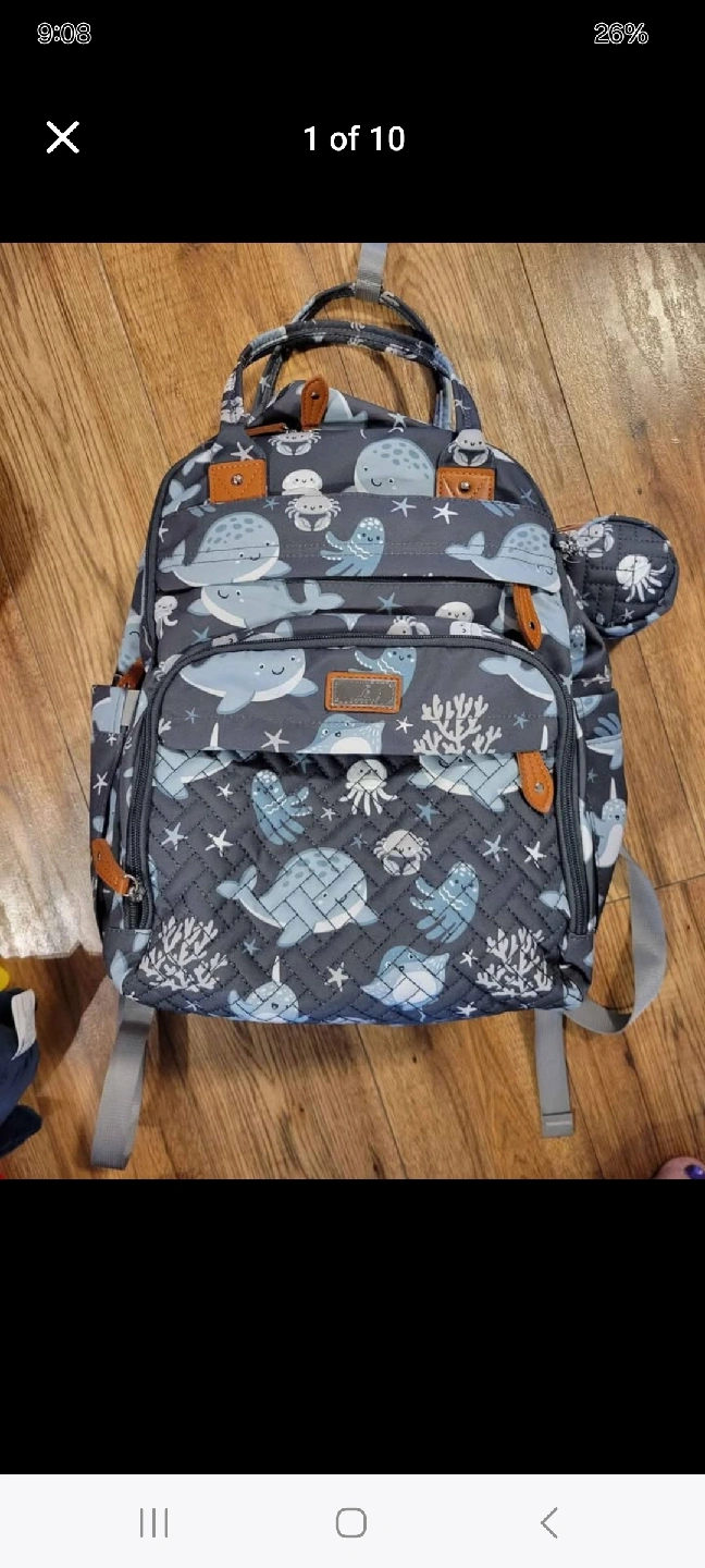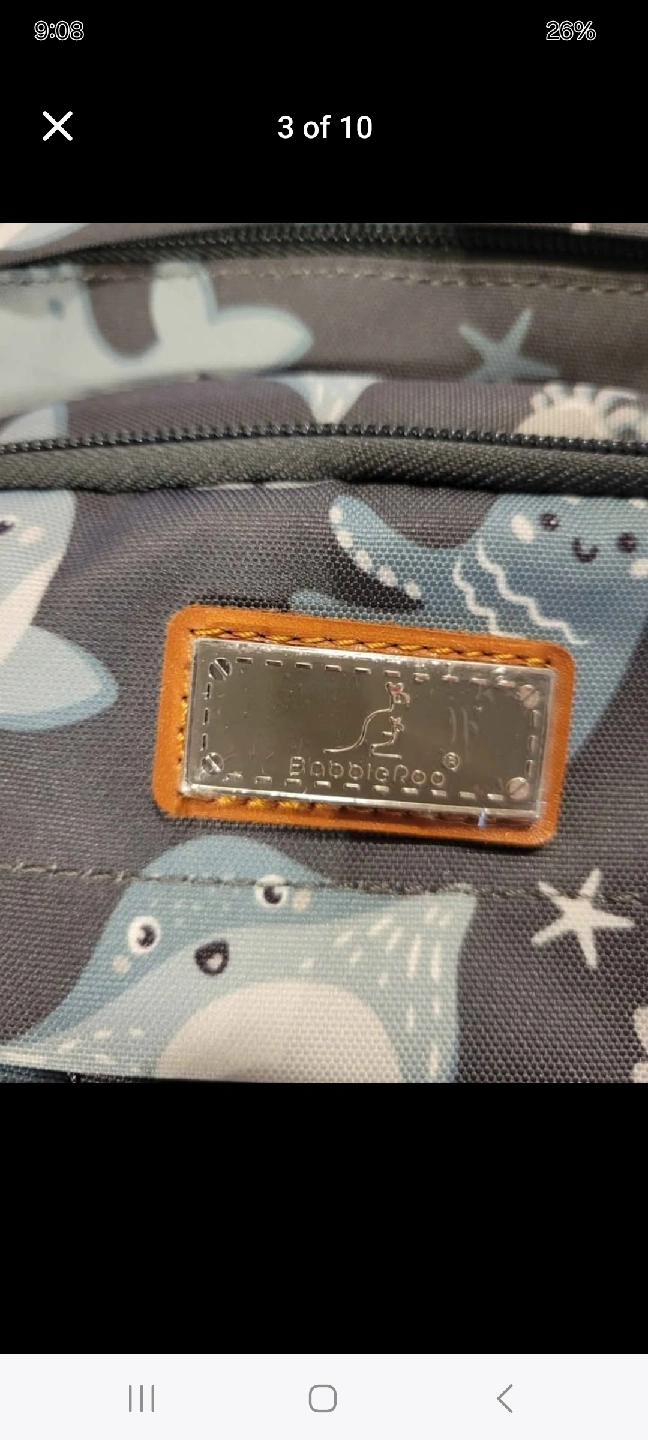 Super cute BobbleRoos backpack with an ocean theme! It features whales, sea turtles, and other sea creatures. It also comes with a small detachable pouch.