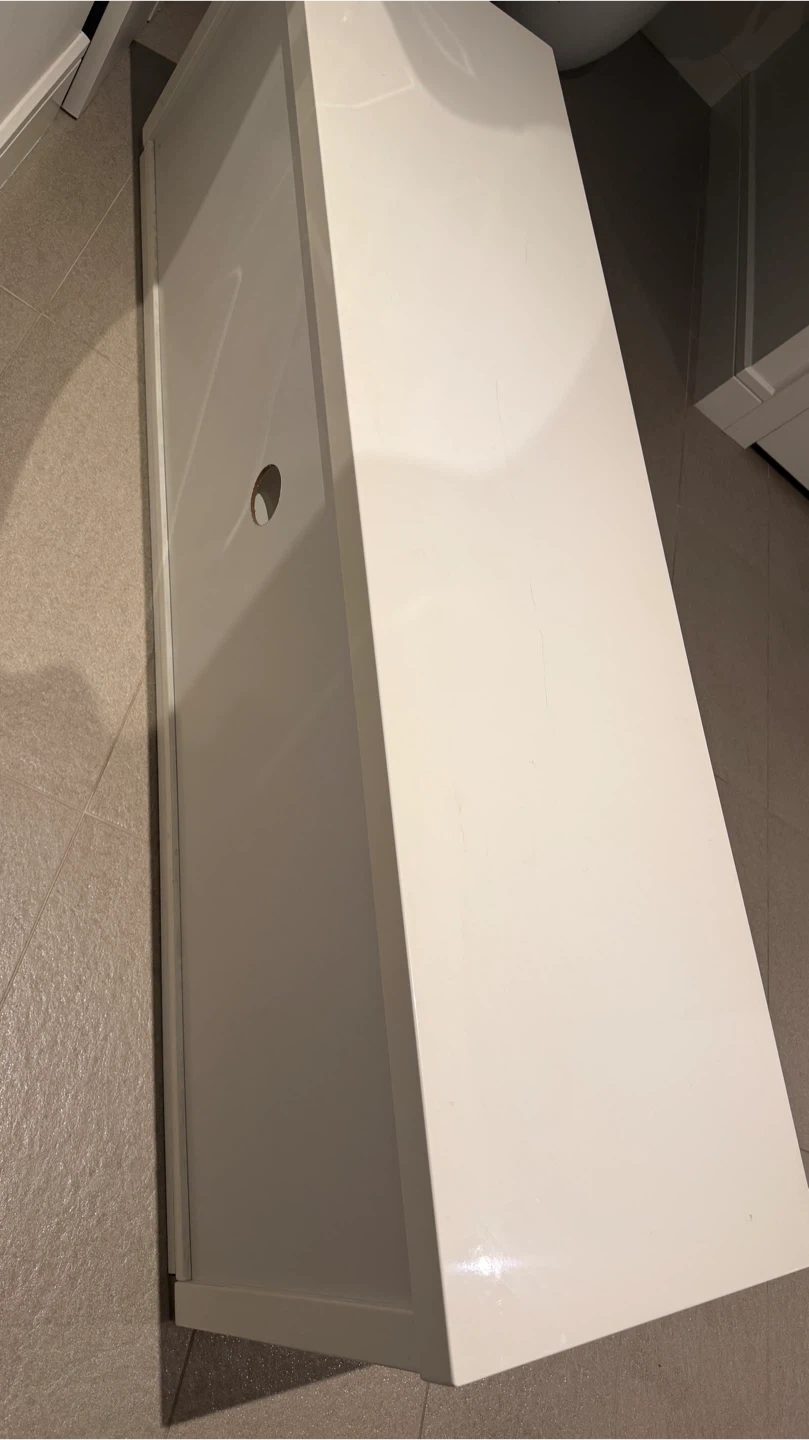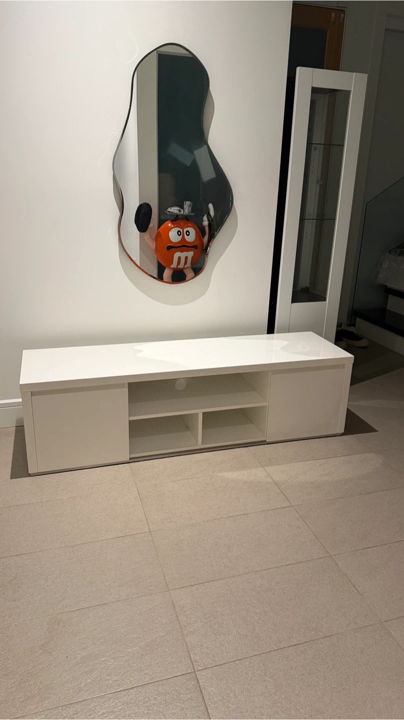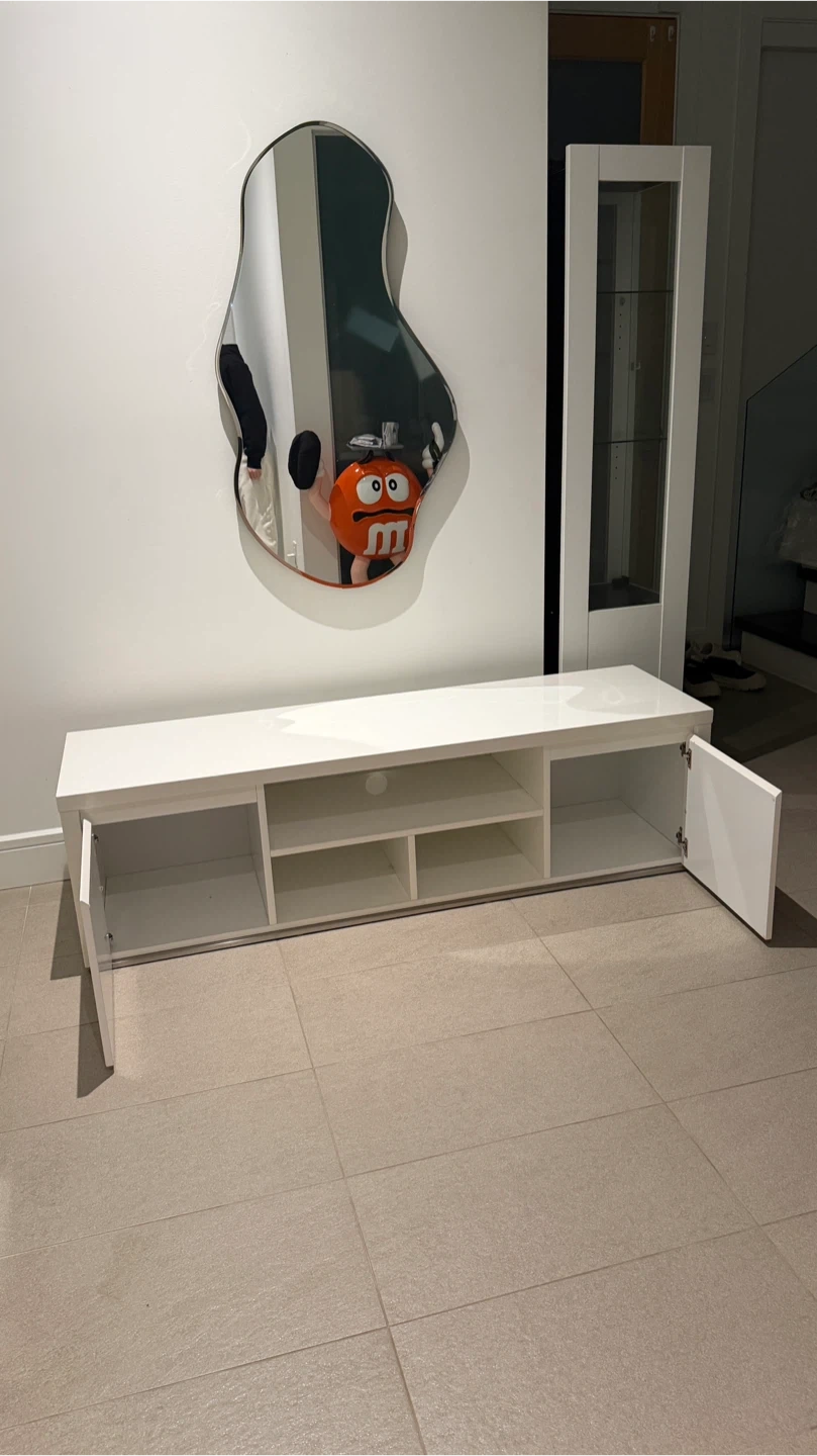 This is a sleek white entertainment stand with two side cabinets and open shelving in the middle. It has cable management holes at the back. Perfect for organizing your media devices and accessories!