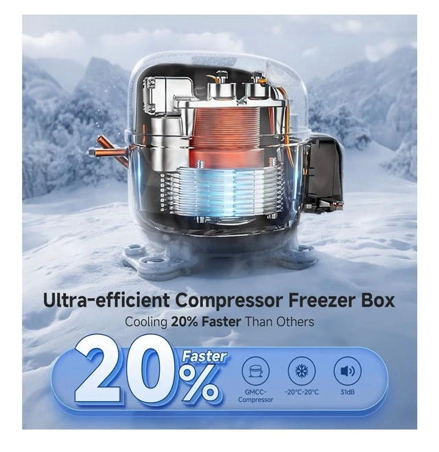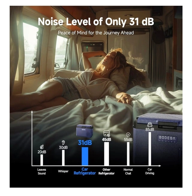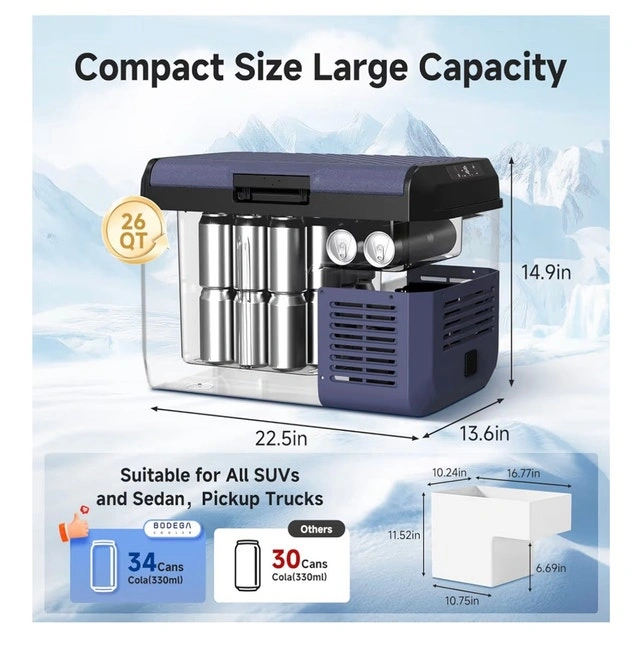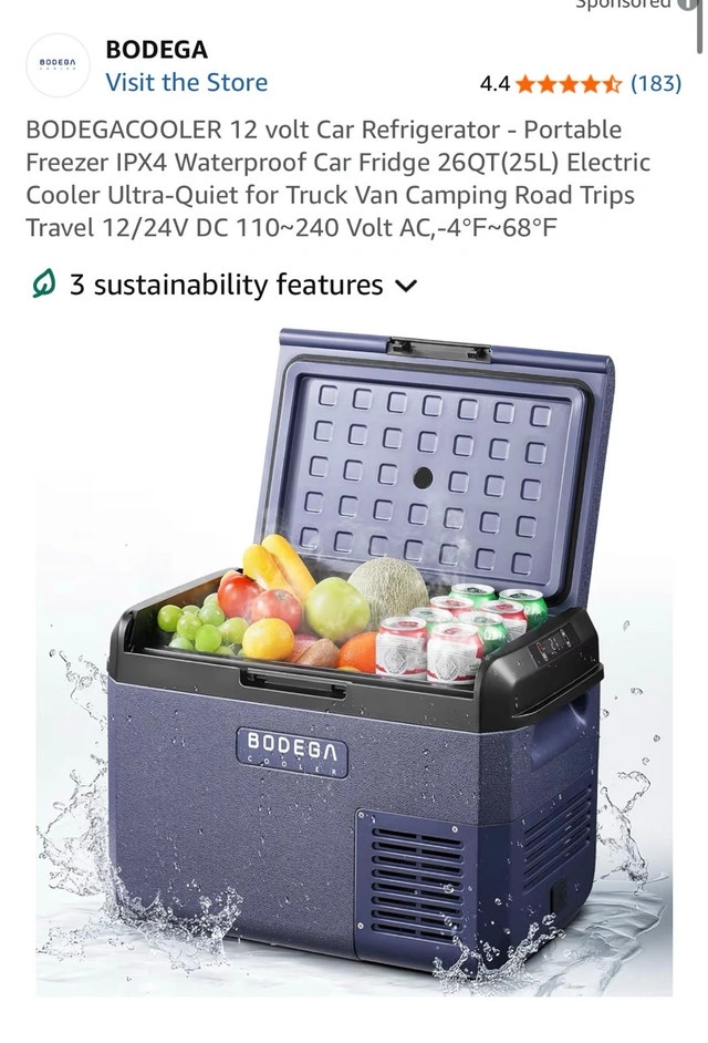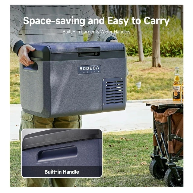 Keep your beverages and snacks chilled on the go with this BODEGACOOLER 12 volt car refrigerator! This portable freezer has a 26 quart (25L) capacity and is designed with an IPX4 waterproof rating, making it perfect for truck, van, camping and road trips. It can operate on both 12/24V DC and 110-240V AC, and it has a temperature range of -4°F to 68°F. This cooler is in new condition.