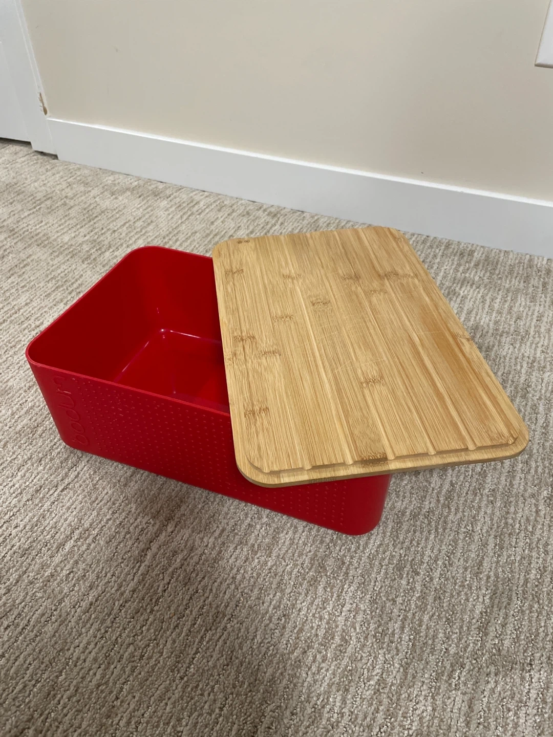 29Selling a Bodum bread box in red with a bamboo lid. It's in great shape and ready to keep your bread fresh! Perfect for any kitchen counter.