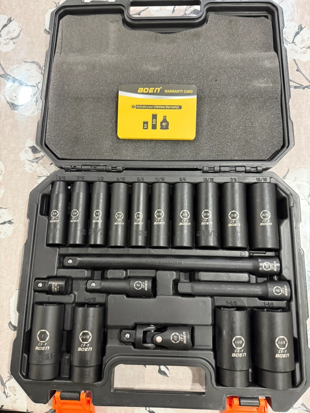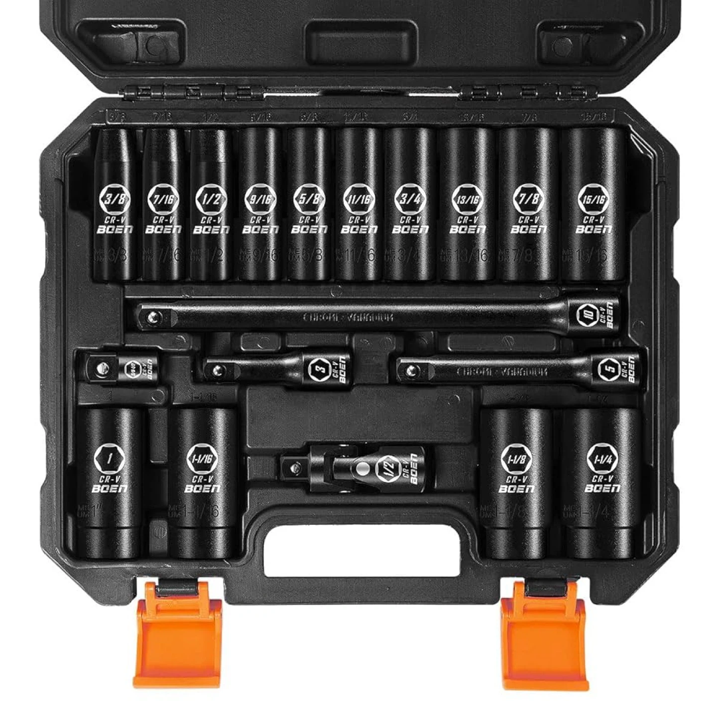 Selling a BOEN 19-piece impact socket set, 1/2" drive. This set includes 14 deep sockets (ranging from 3/8" to 1-1/4"), 3 extension bars (3", 5", 10"), 1 universal joint (1/2"), and 1 adapter (3/8"-1/2"). It also comes with a handy carrying case to keep everything organized and protected