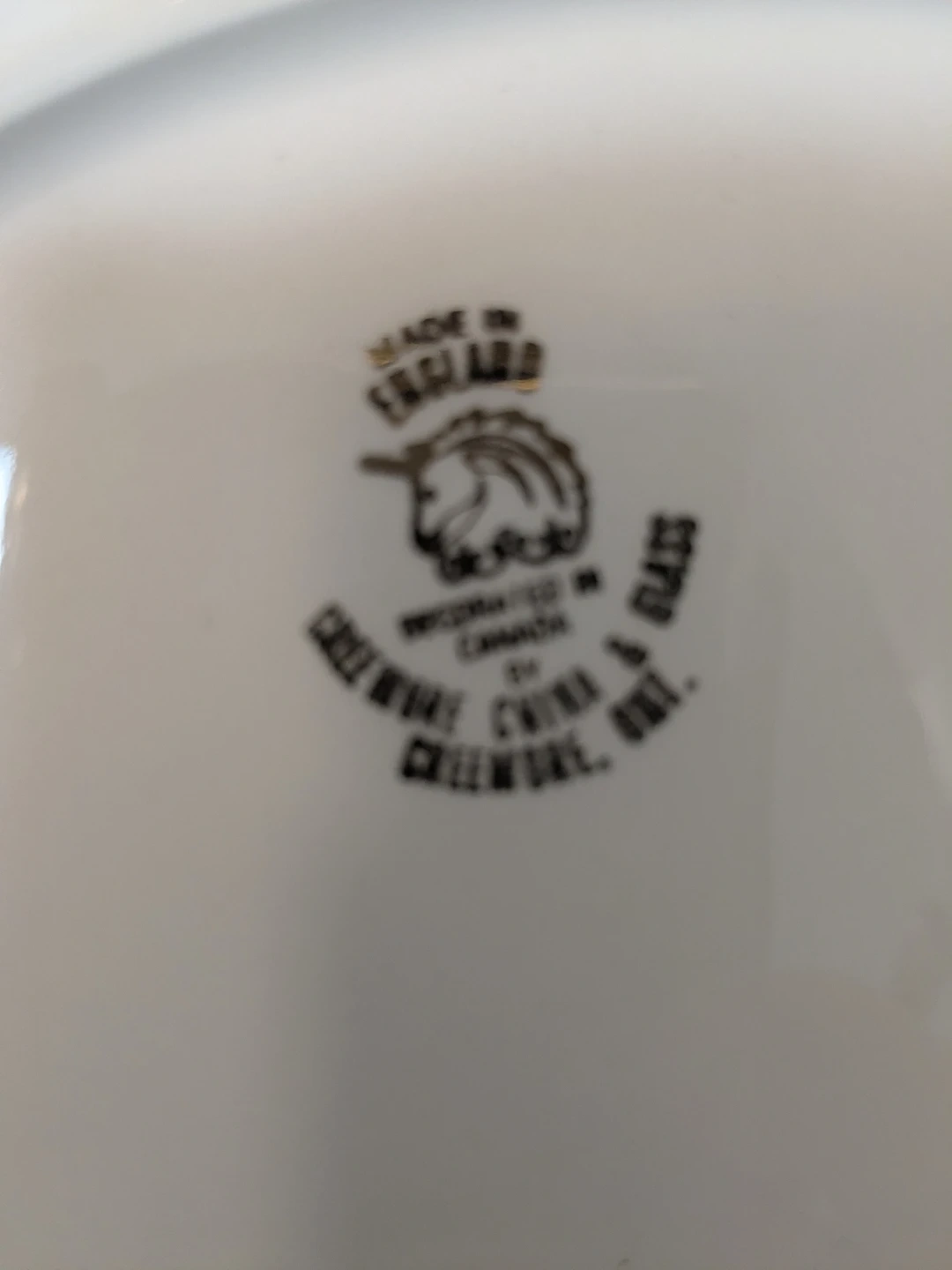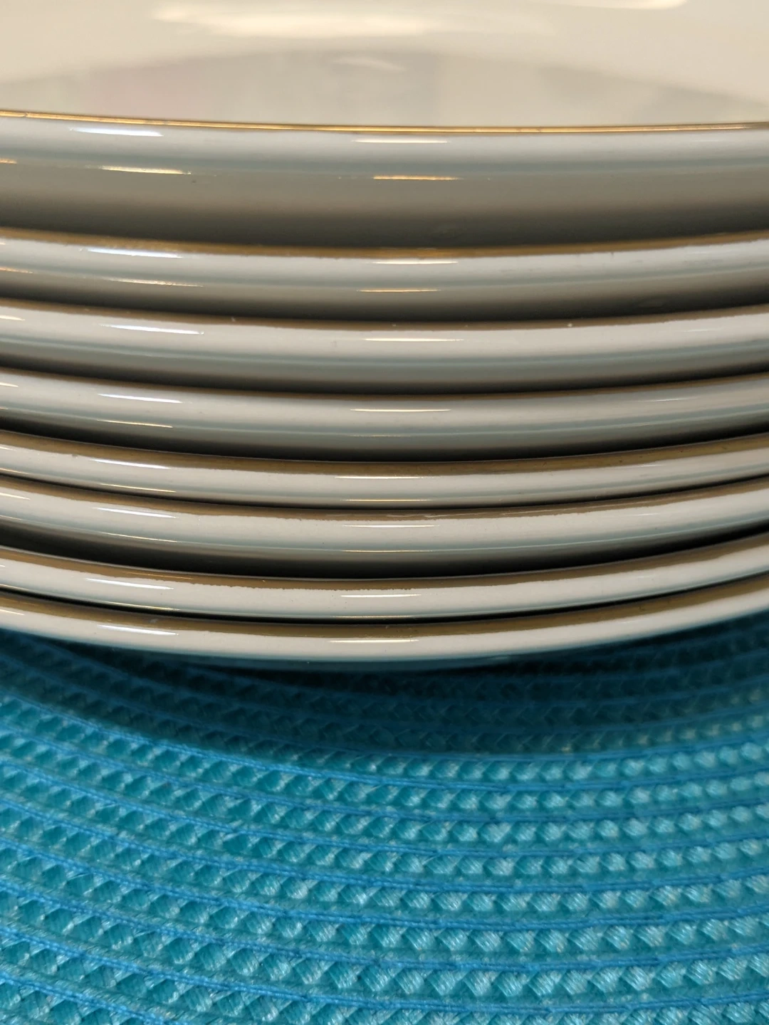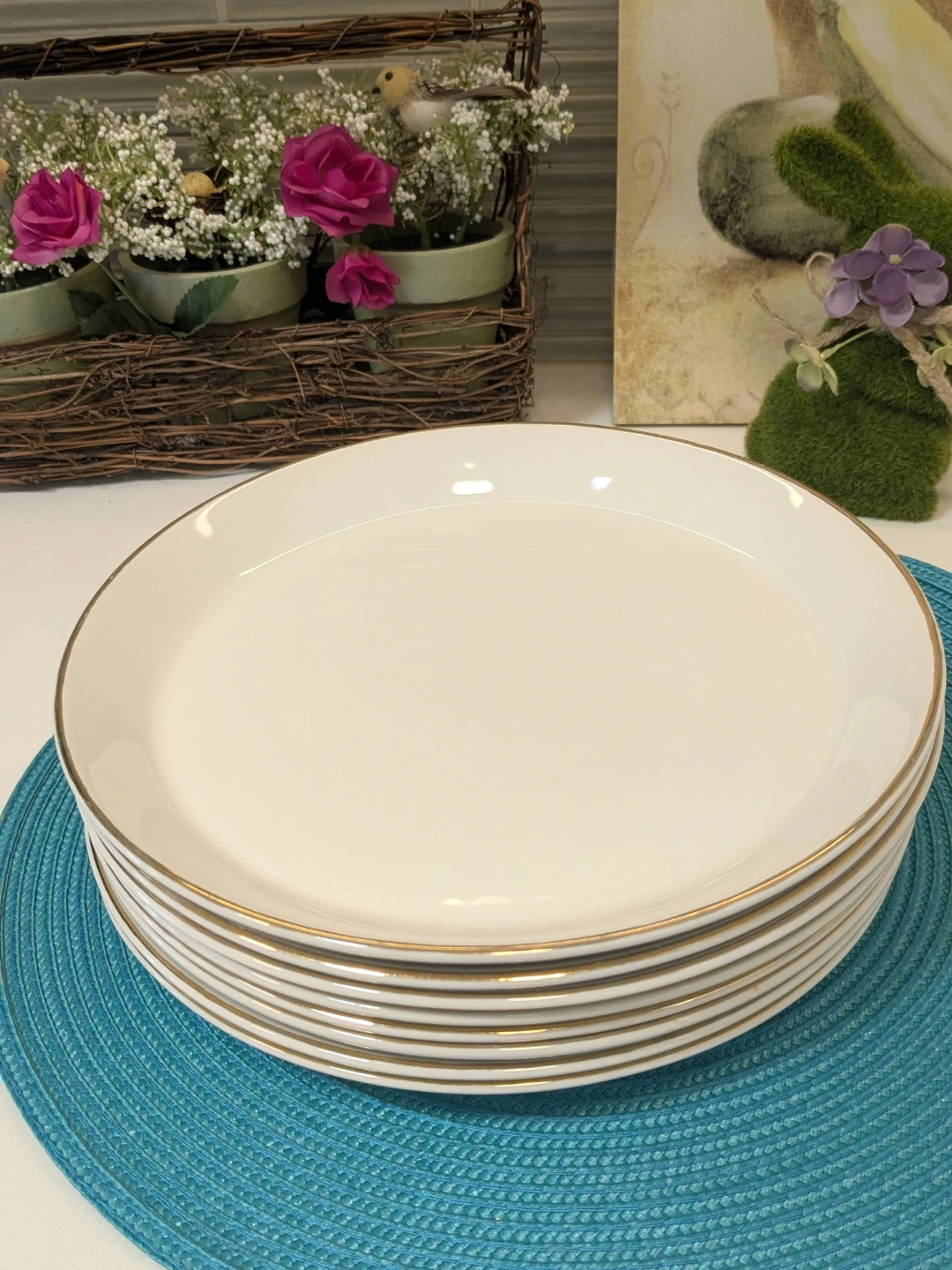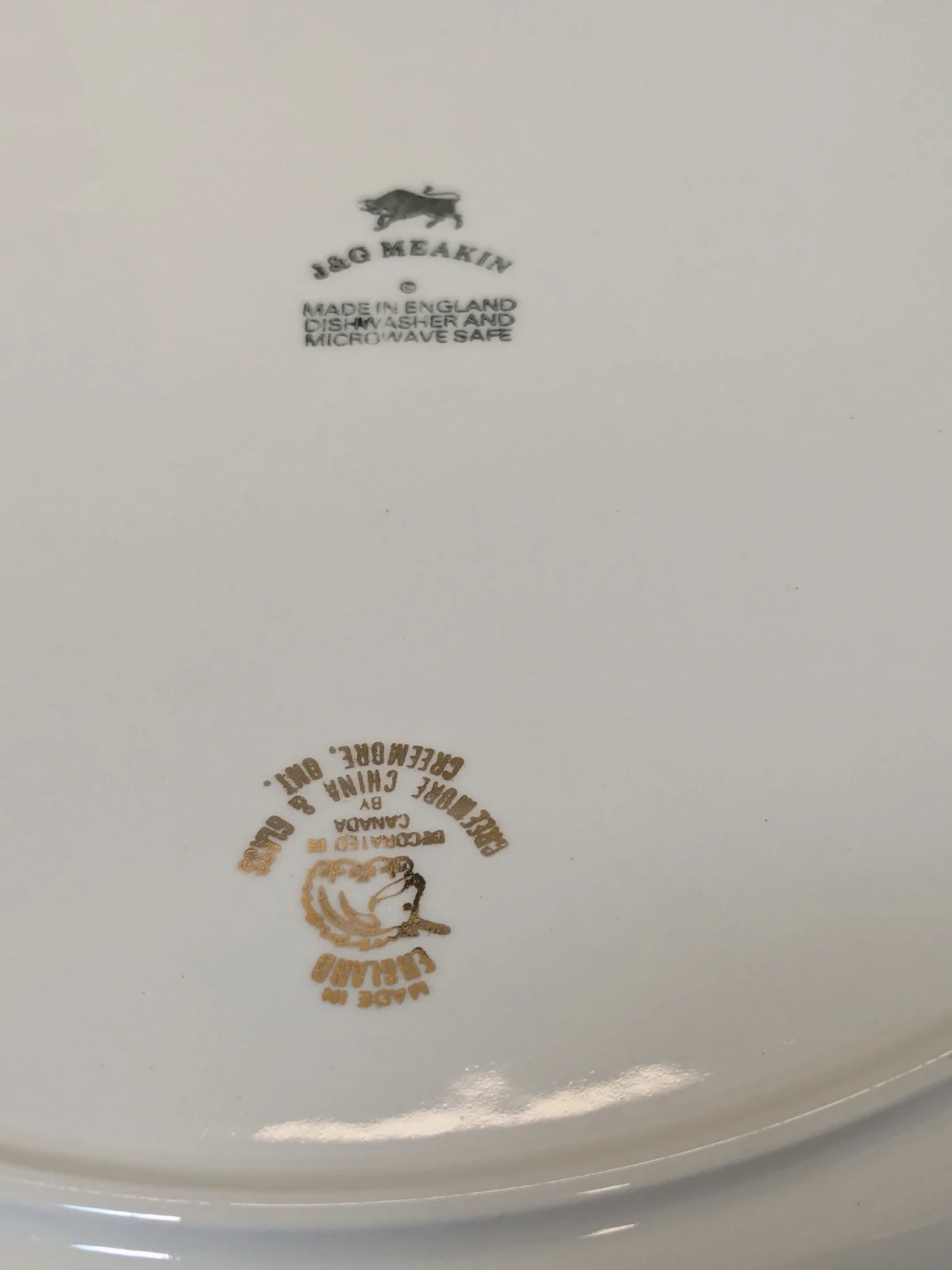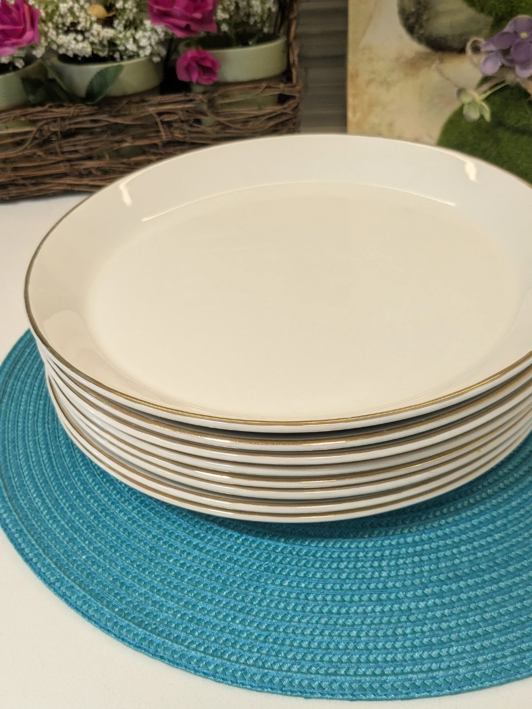 A set of 8 J&G Meakin Greemore plates, made in England. These plates are dishwasher and microwave safe. The gold trim adds an elegant touch.