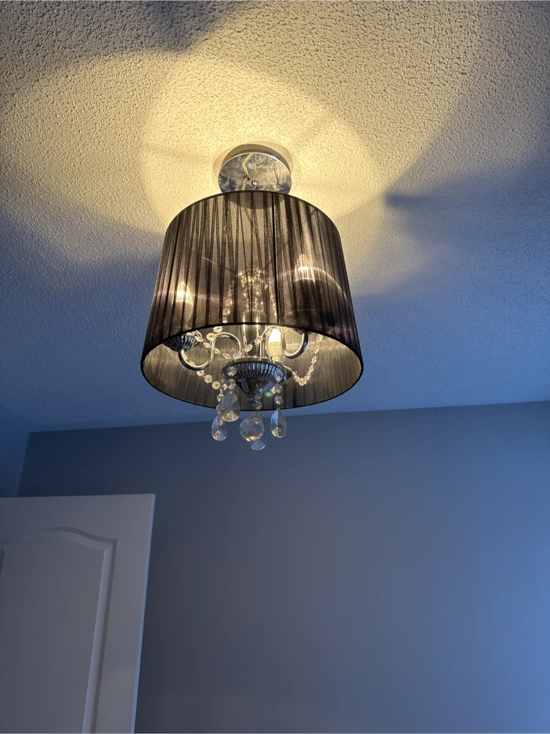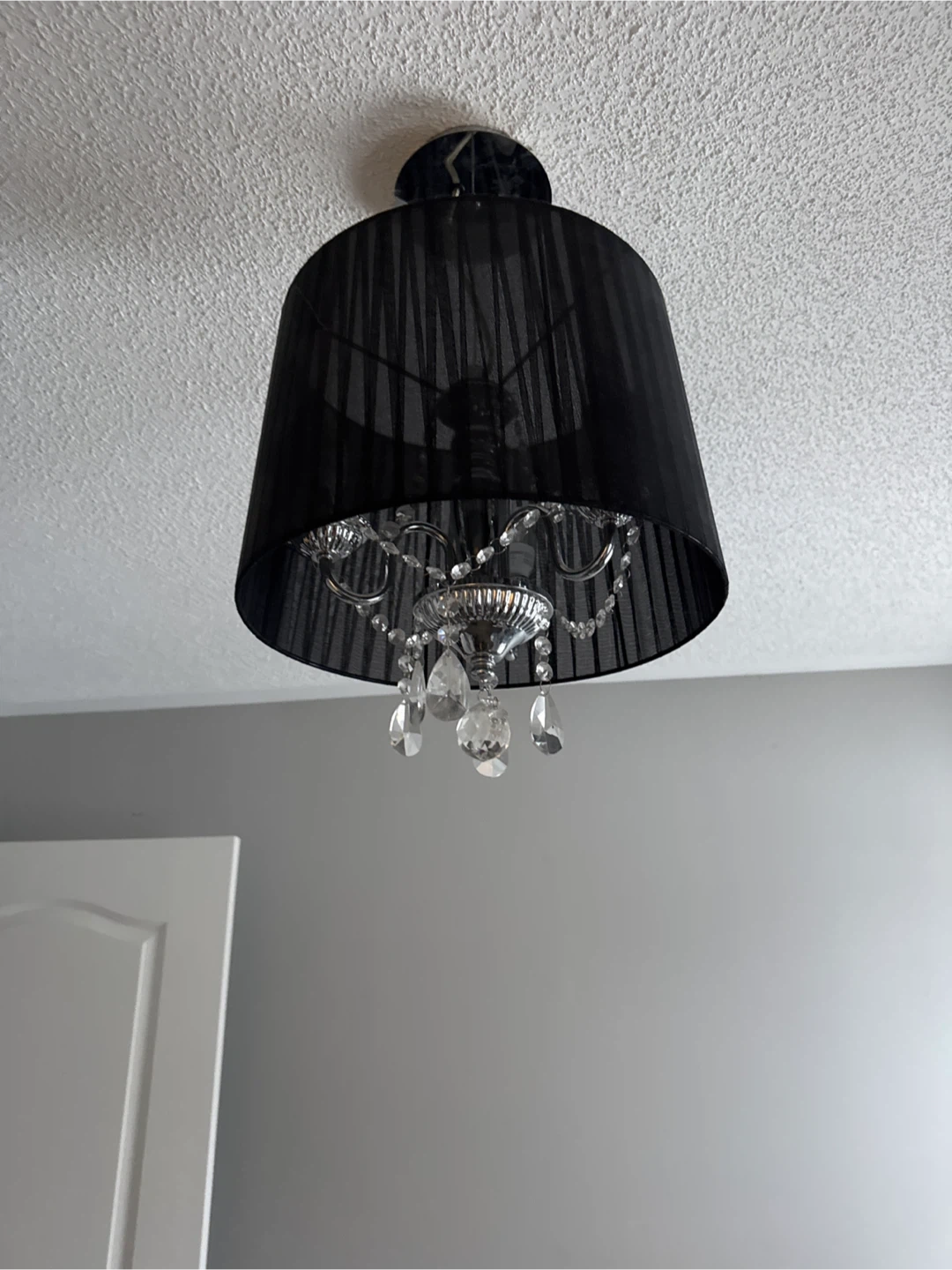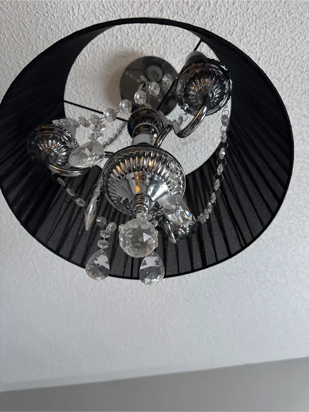 Selling a stylish black chandelier ceiling light! It features a black shade with crystal accents, adding a touch of elegance to any room. Perfect for dining rooms, bedrooms, or entryways