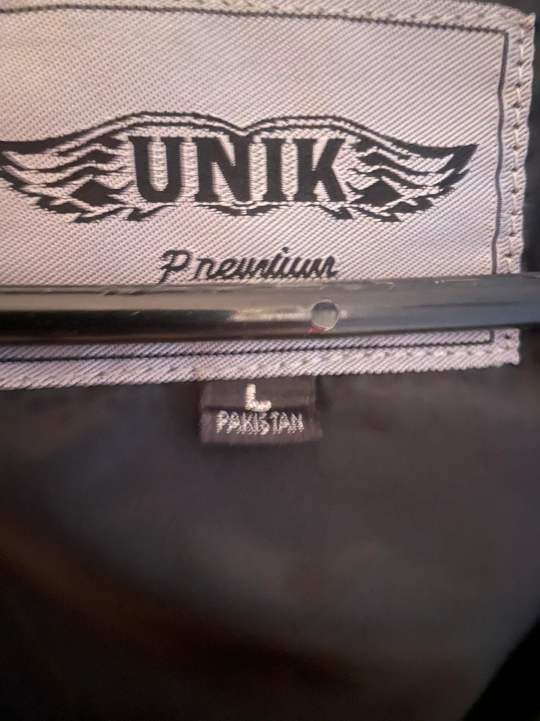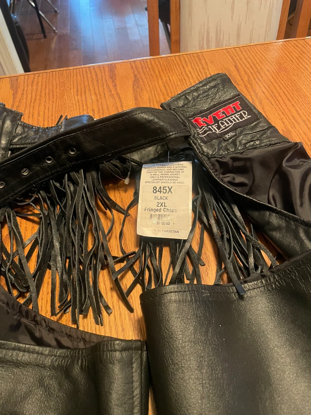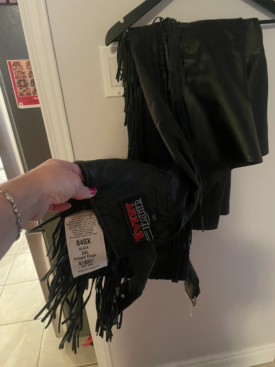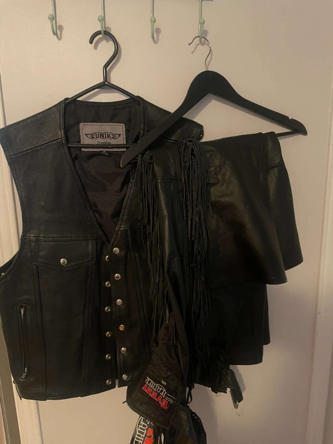 This UNIK Premium leather motorcycle vest and fringed chaps set is made for riding. The vest is size L and the chaps are size 2XL in black. Both pieces are crafted from genuine leather.